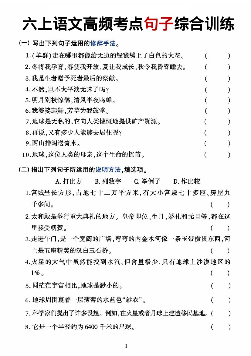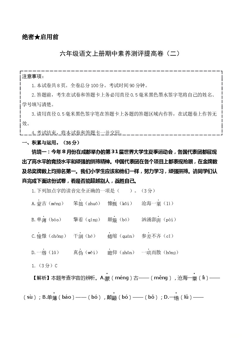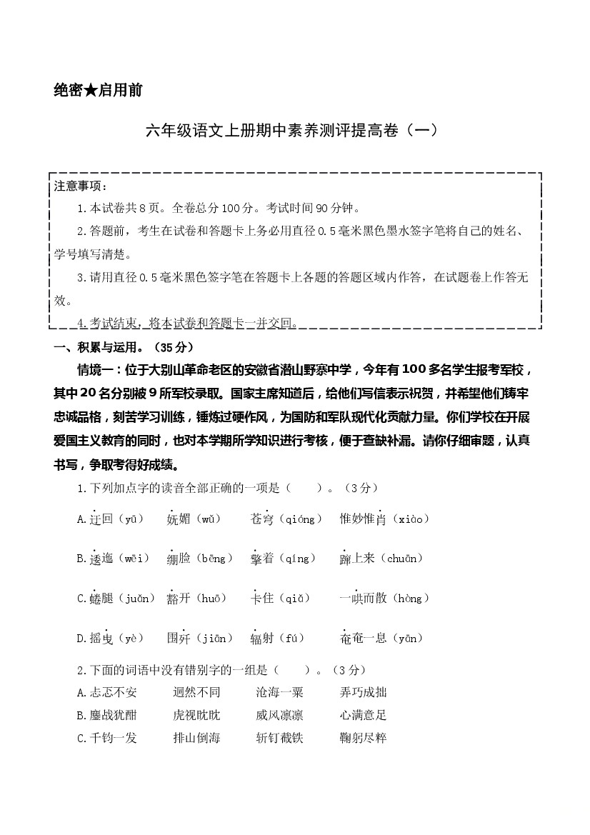 25年秋六上语文期中素养测评提高卷(一)(统编版)A4版