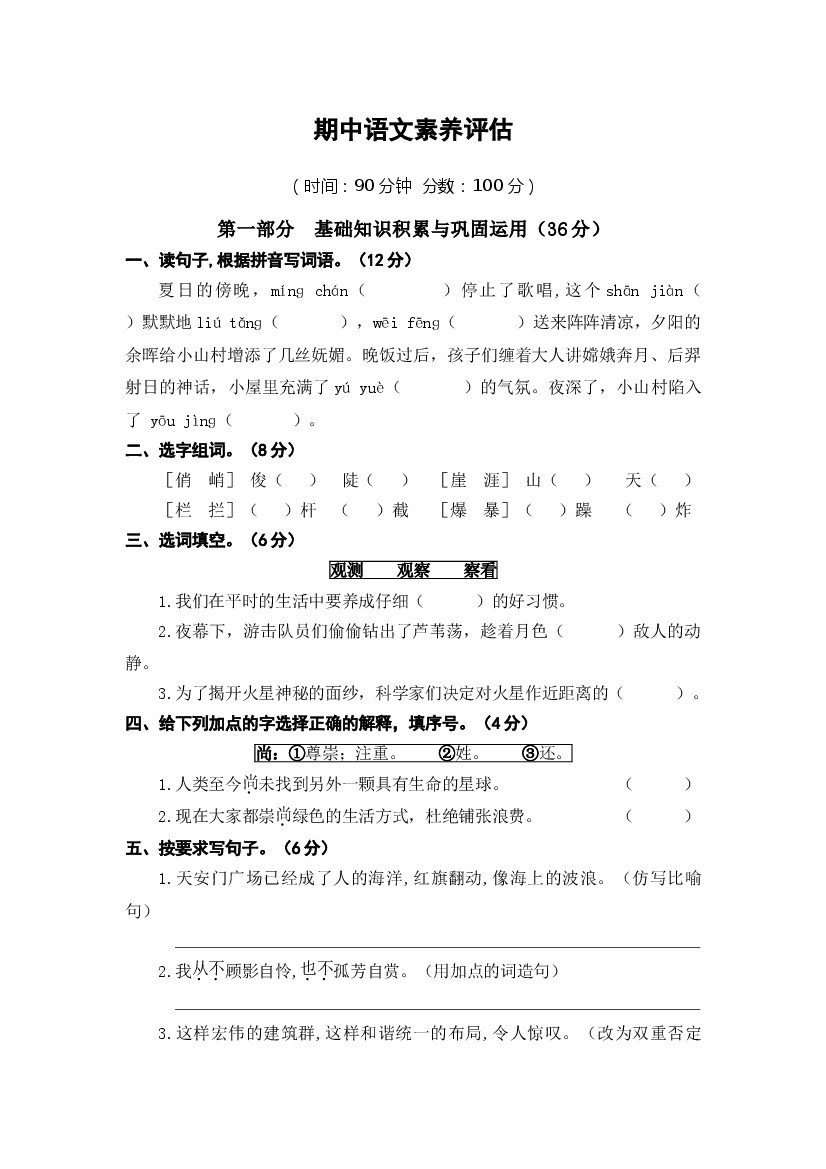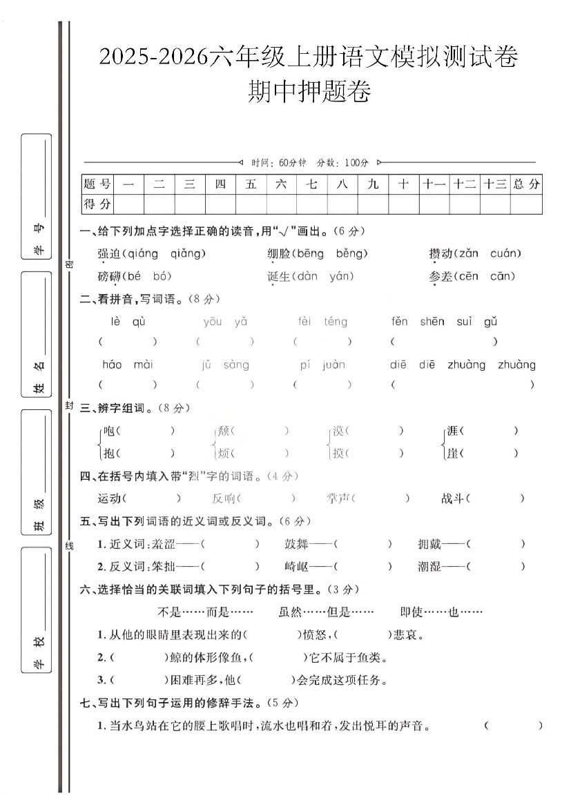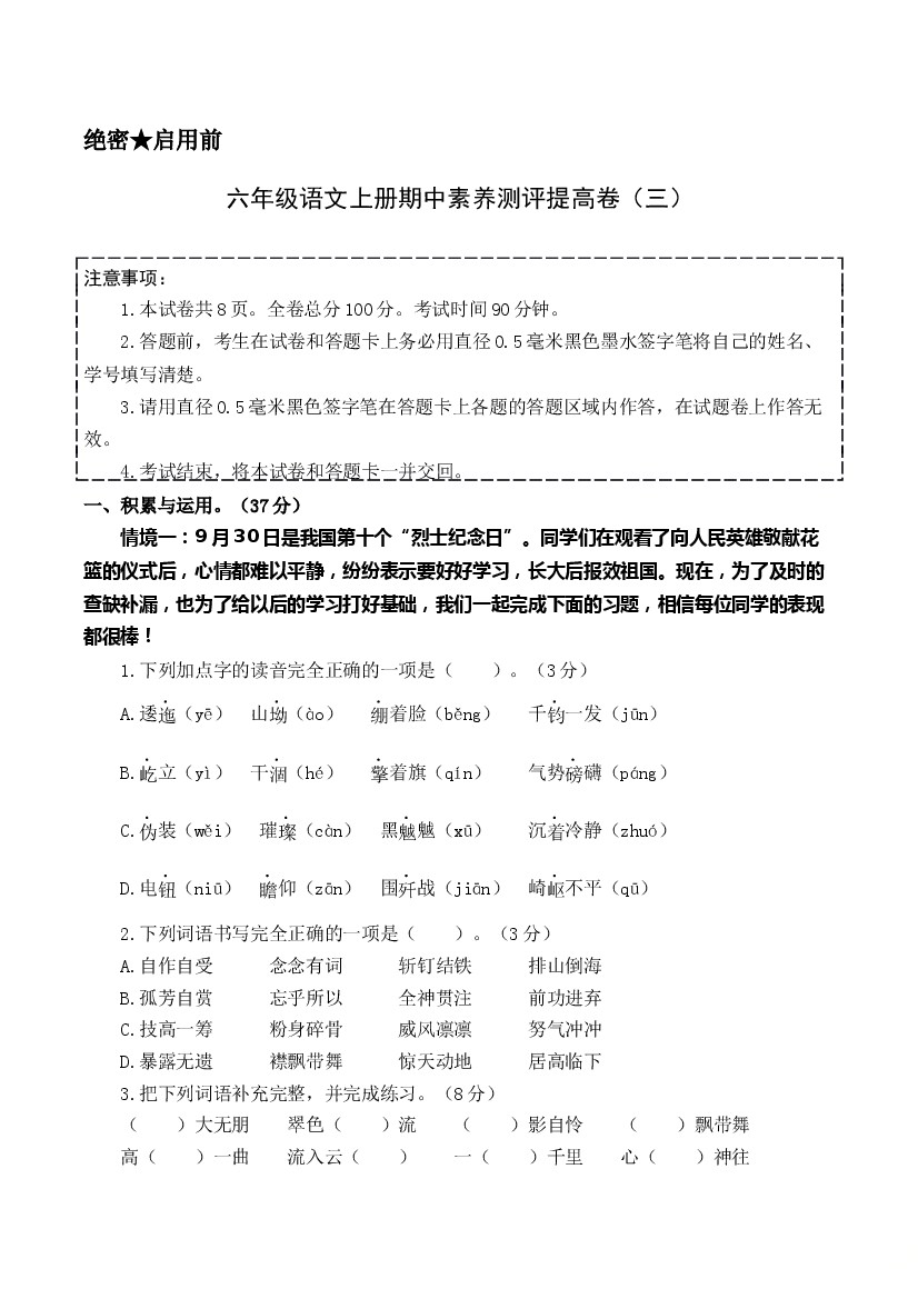 25年秋六上语文期中素养测评提高卷(三)(统编版)A4版