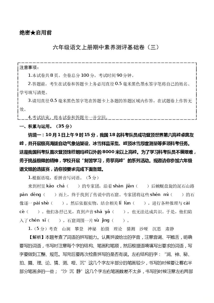 25年秋六上语文期中素养测评基础卷(三)(统编版)全解全析