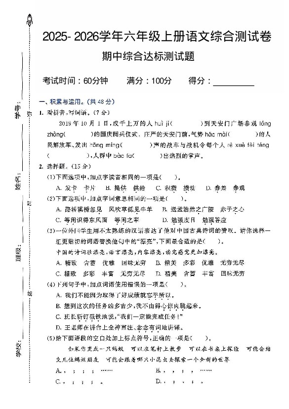 25年秋六上语文期中素养测评基础卷(二)(统编版)A4版