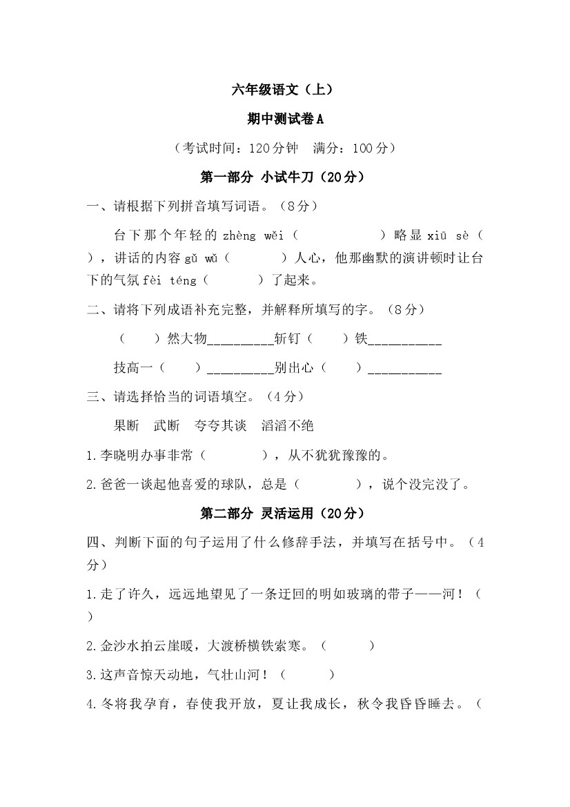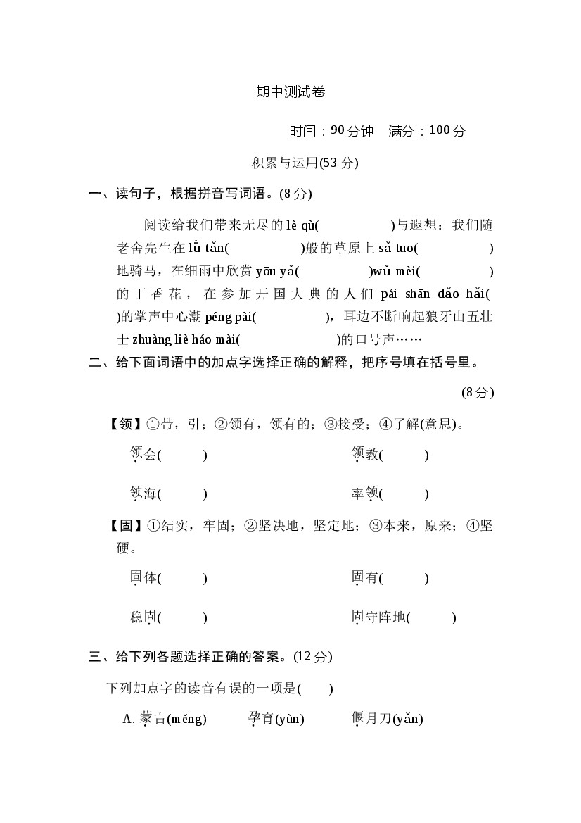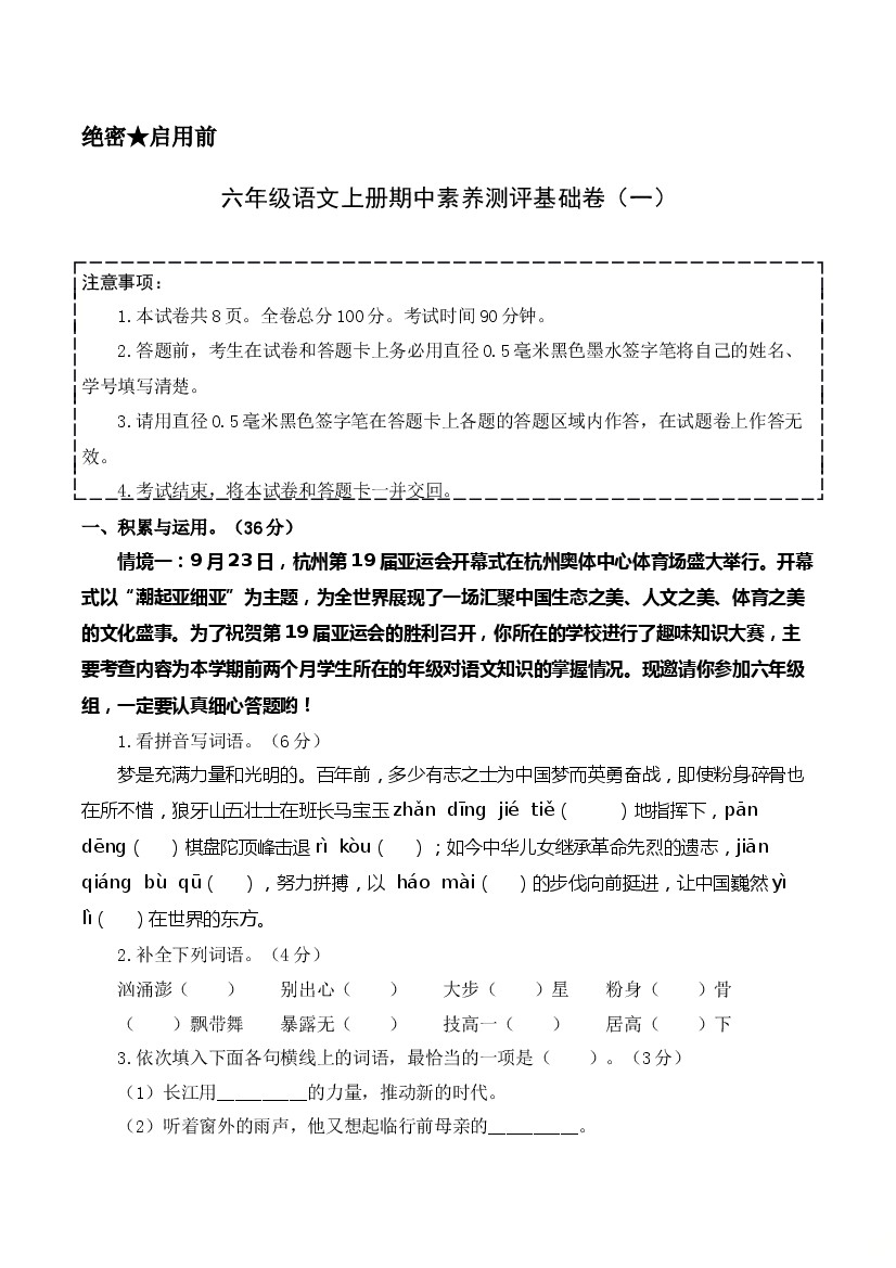25年秋六上语文期中素养测评基础卷(一)(统编版)A4版