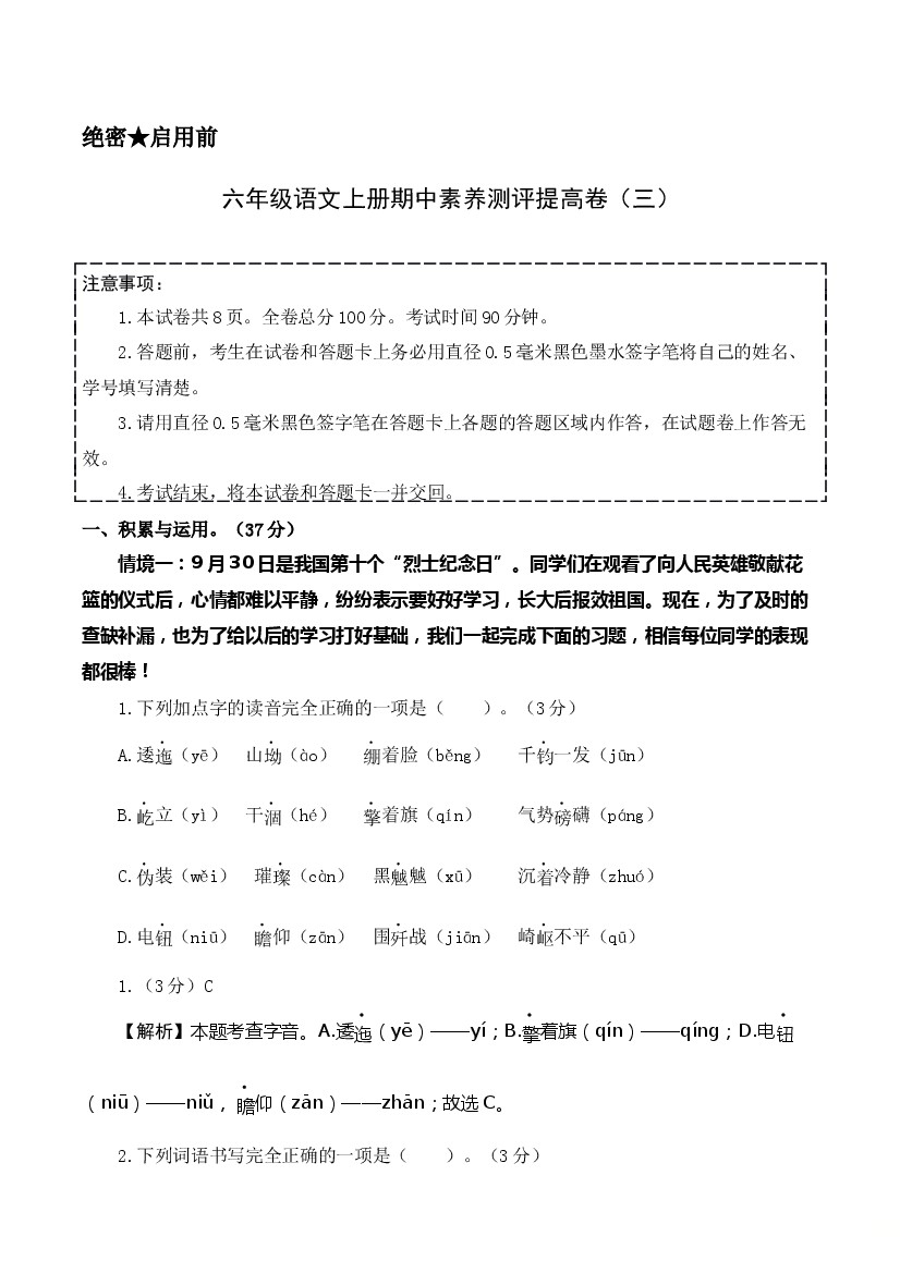 25年秋六上语文期中素养测评提高卷(三)(统编版)全解全析
