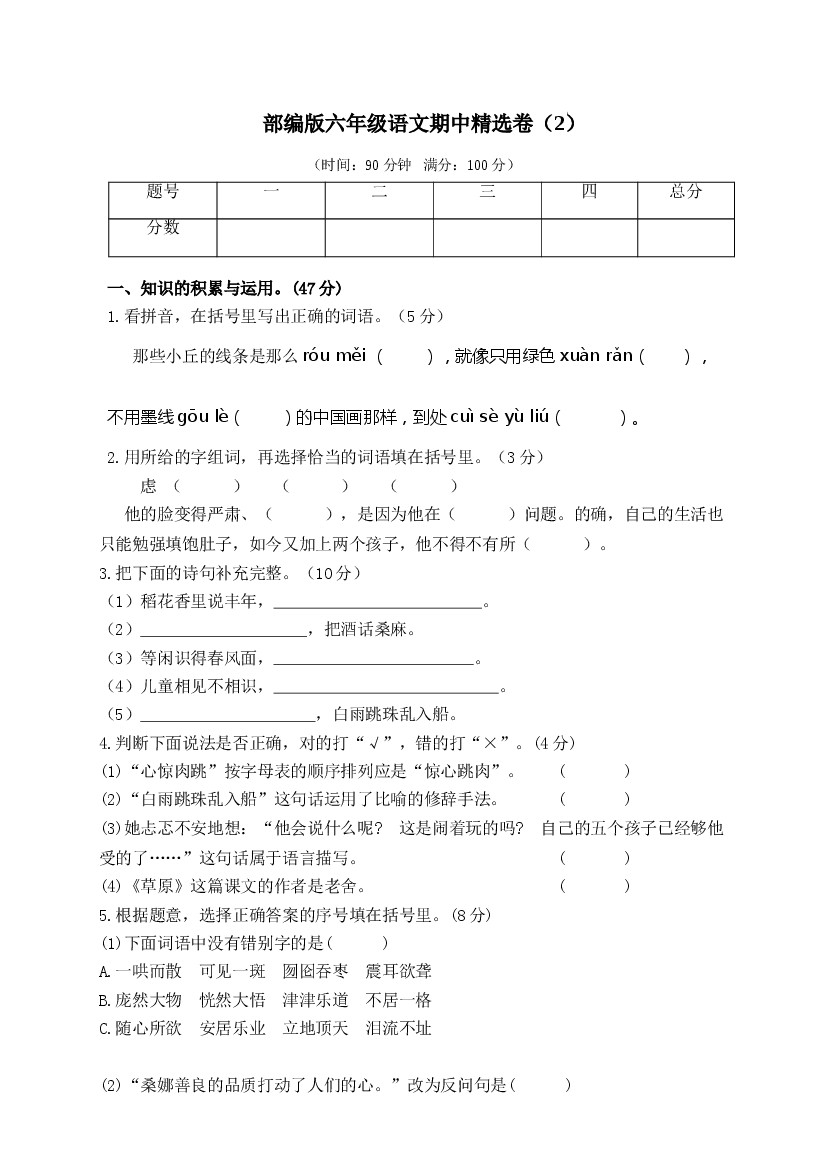 25年秋六上语文期中精选卷(2)(附参考答案)