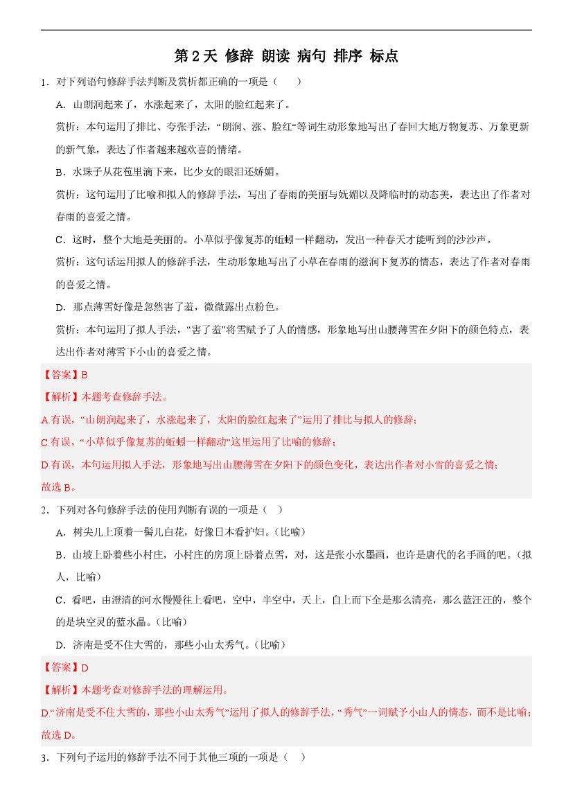 【七上语文】02修辞朗读病句排序标点--2025国庆7天练(解析版)