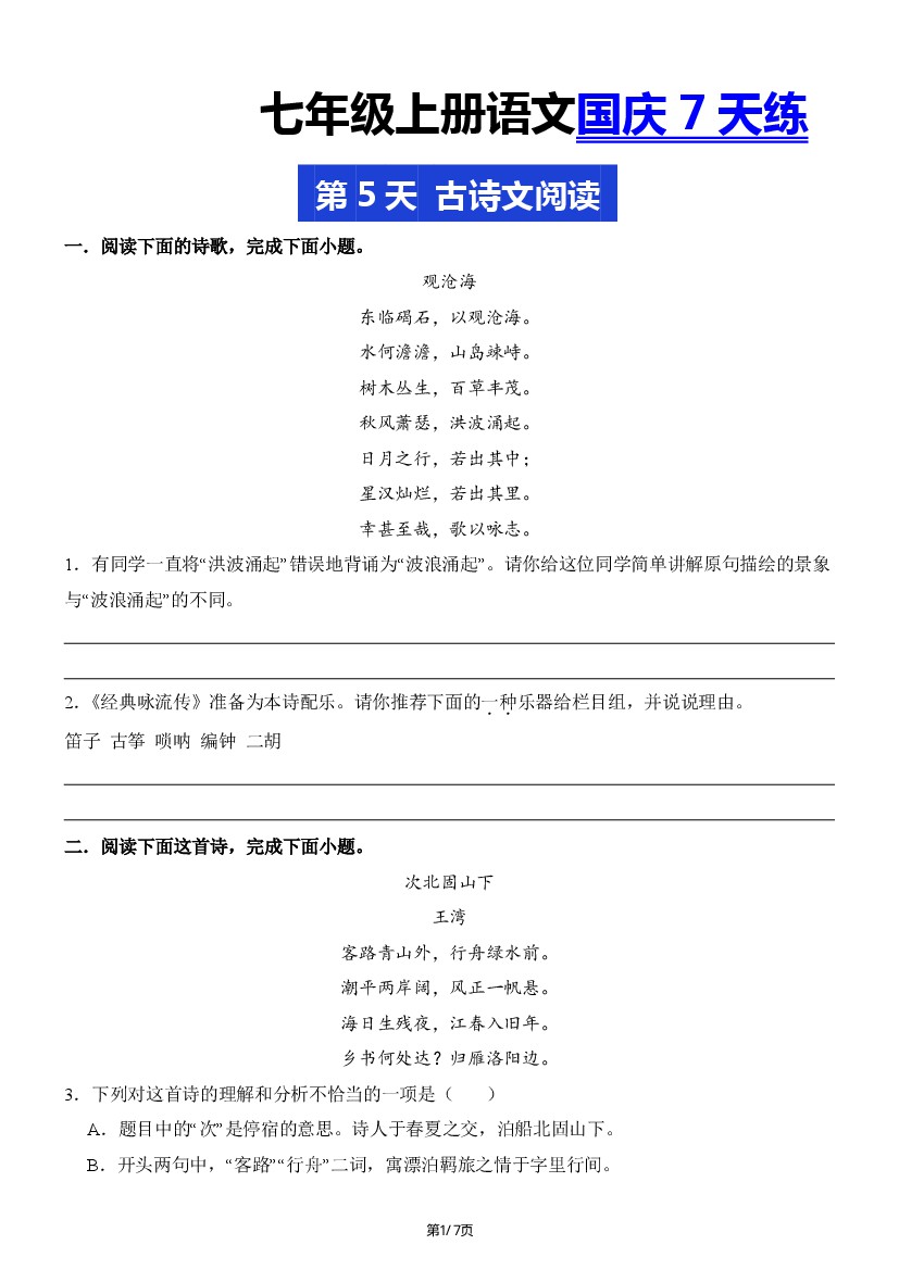 【七上语文】05古诗文阅读--2025国庆7天练(原卷版)