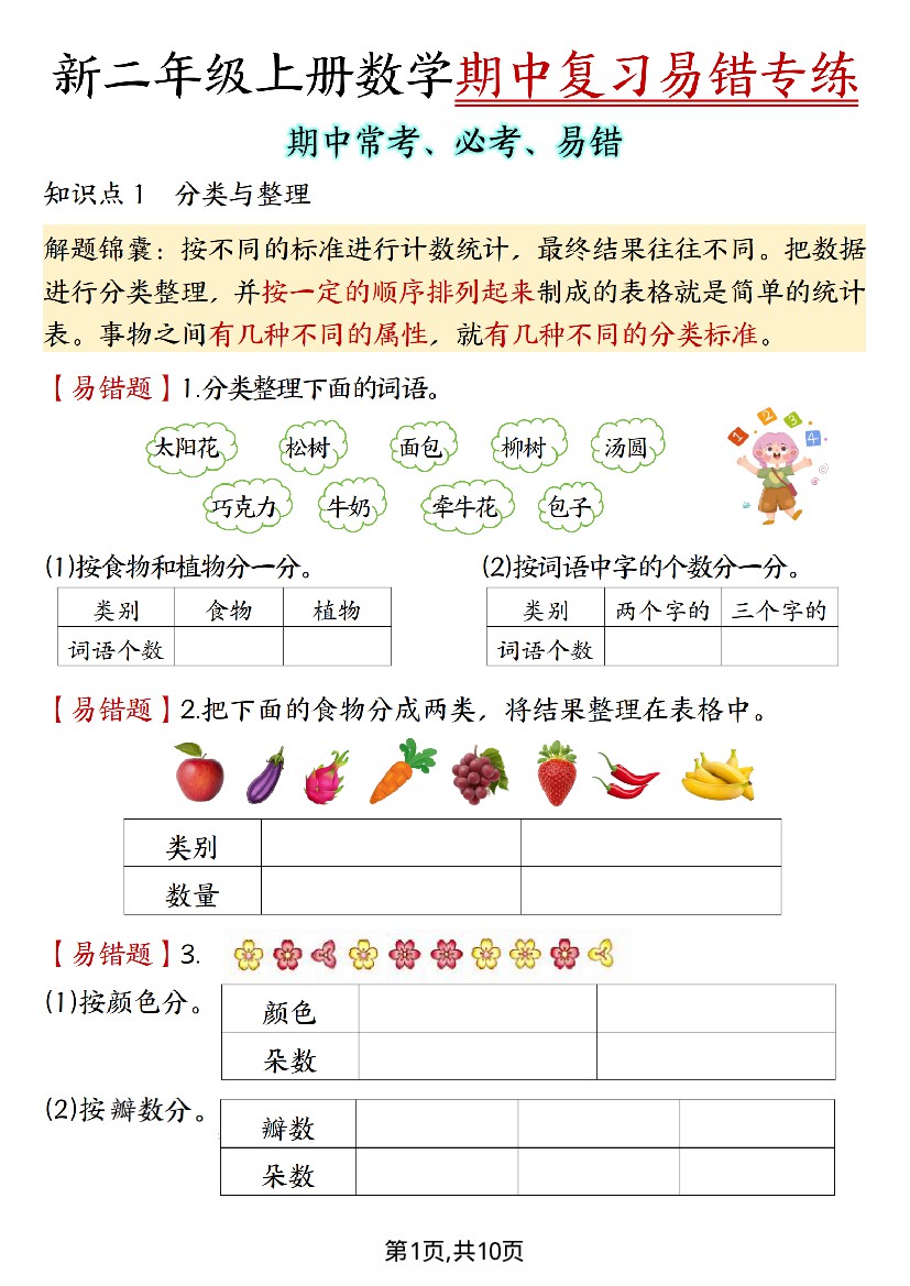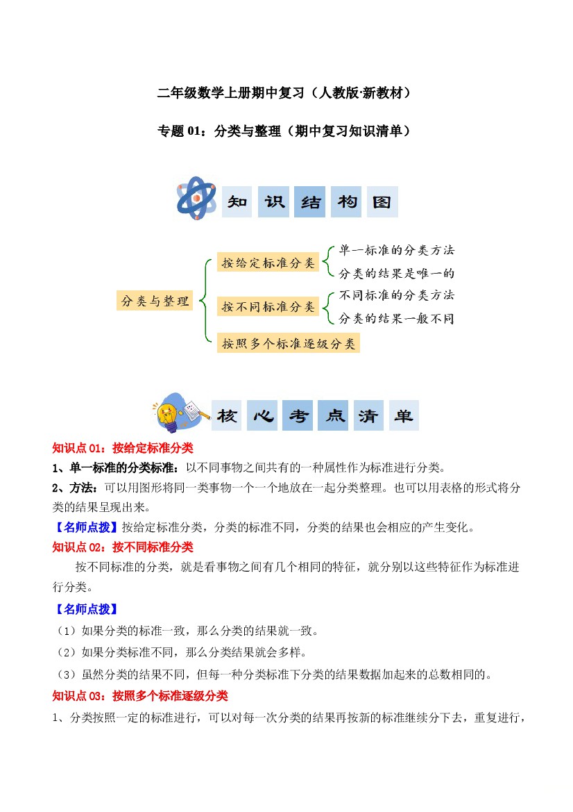 专题01:分类与整理(期中知识清单)二年级数学上册(人教版·新教材)(学生版)