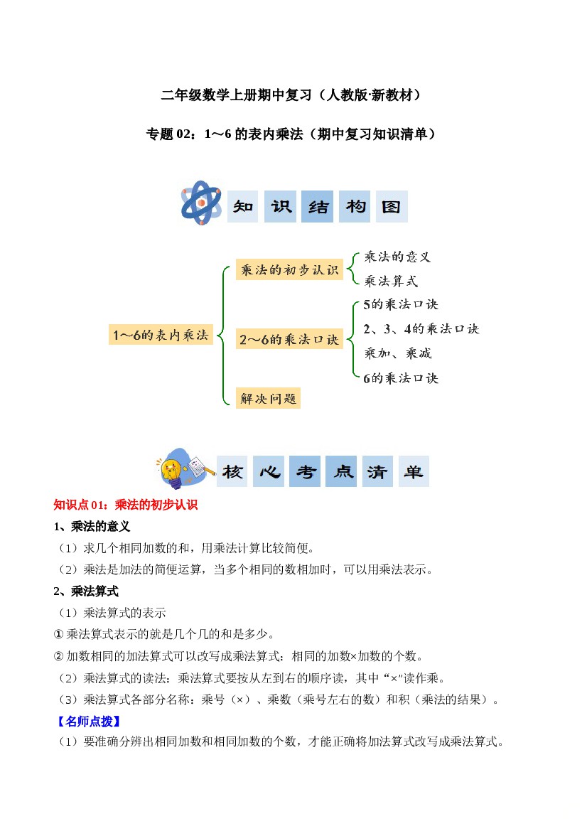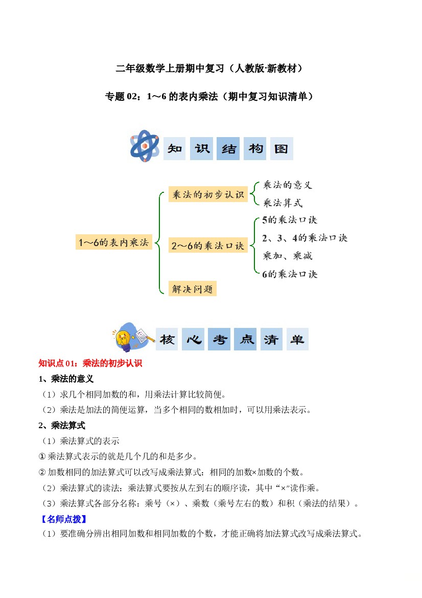 专题02:1~6的表内乘法(期中知识清单)二年级数学上册(人教版·新教材)(学生版)