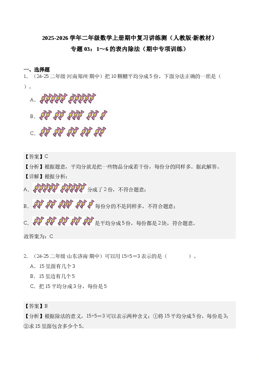 专题03:1~6的表内除法(期中专项训练)二年级数学上册(人教版·新教材)(解析版)