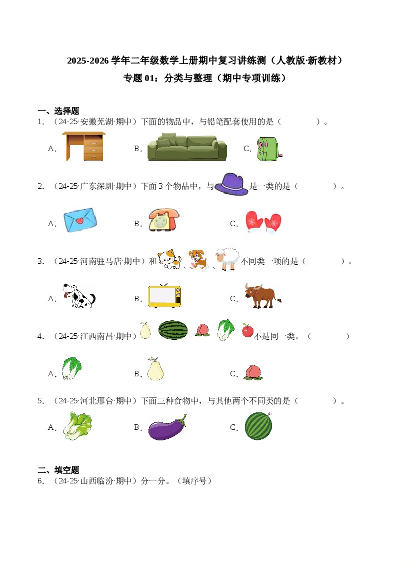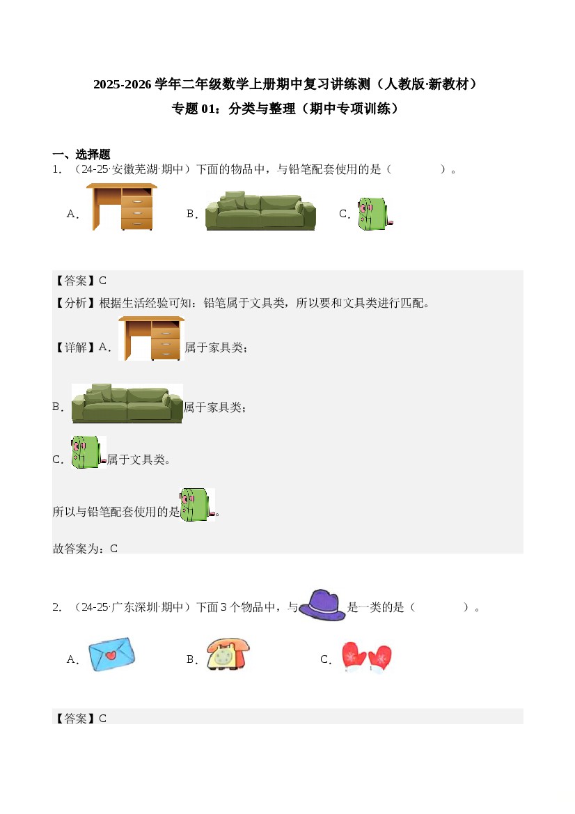 专题01:分类与整理(期中专项训练)二年级数学上册(人教版·新教材)(学生版)