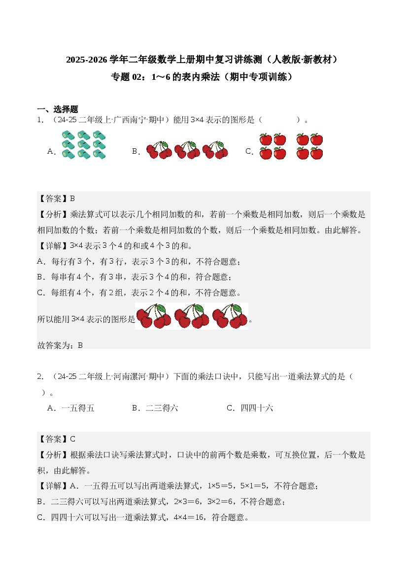 专题02:1~6的表内乘法(期中专项训练)二年级数学上册(人教版·新教材)(解析版)