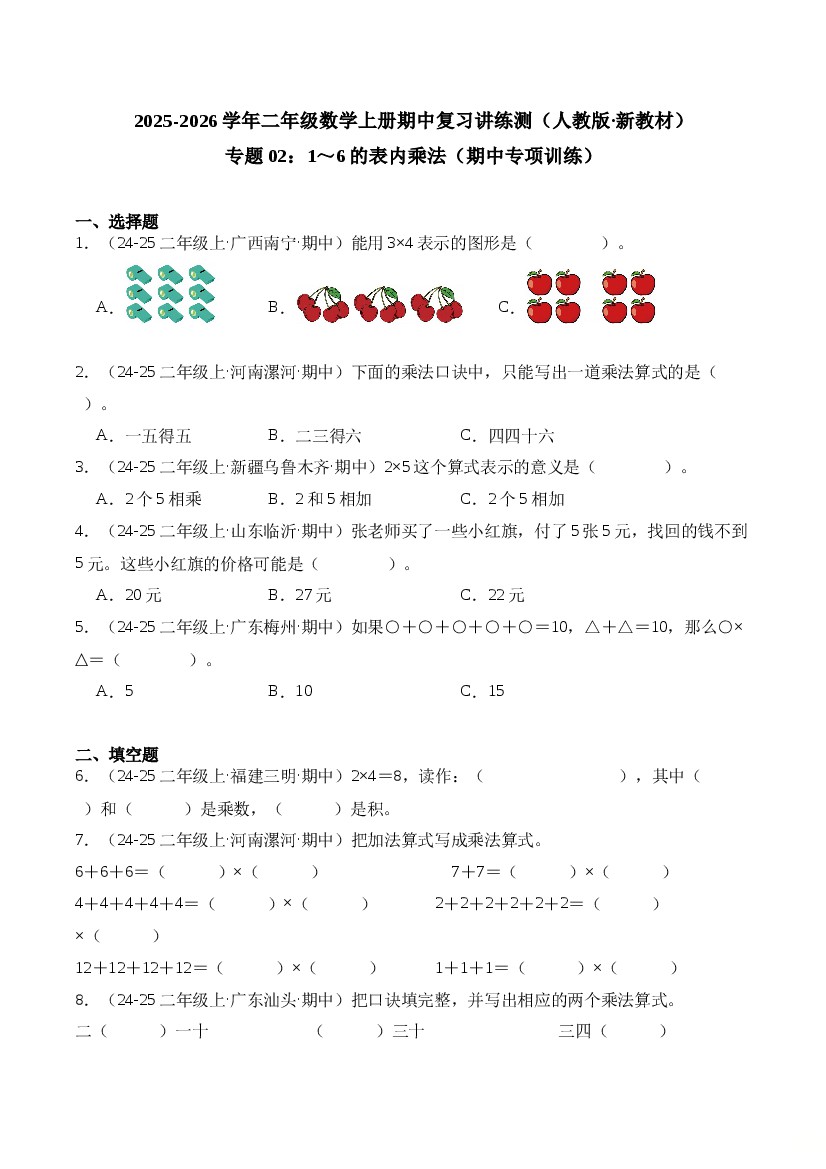 专题02:1~6的表内乘法(期中专项训练)二年级数学上册(人教版·新教材)(学生版)
