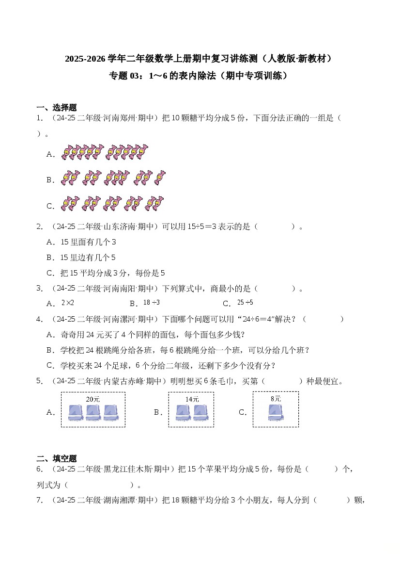 专题03:1~6的表内除法(期中专项训练)二年级数学上册(人教版·新教材)(学生版)