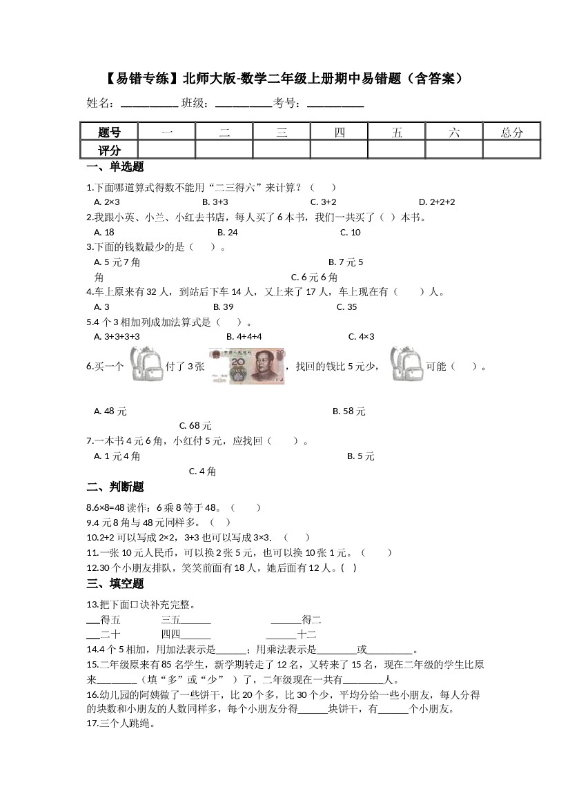 【易错专练】小学数学二年级上册-期中易错题(含答案)北师大版