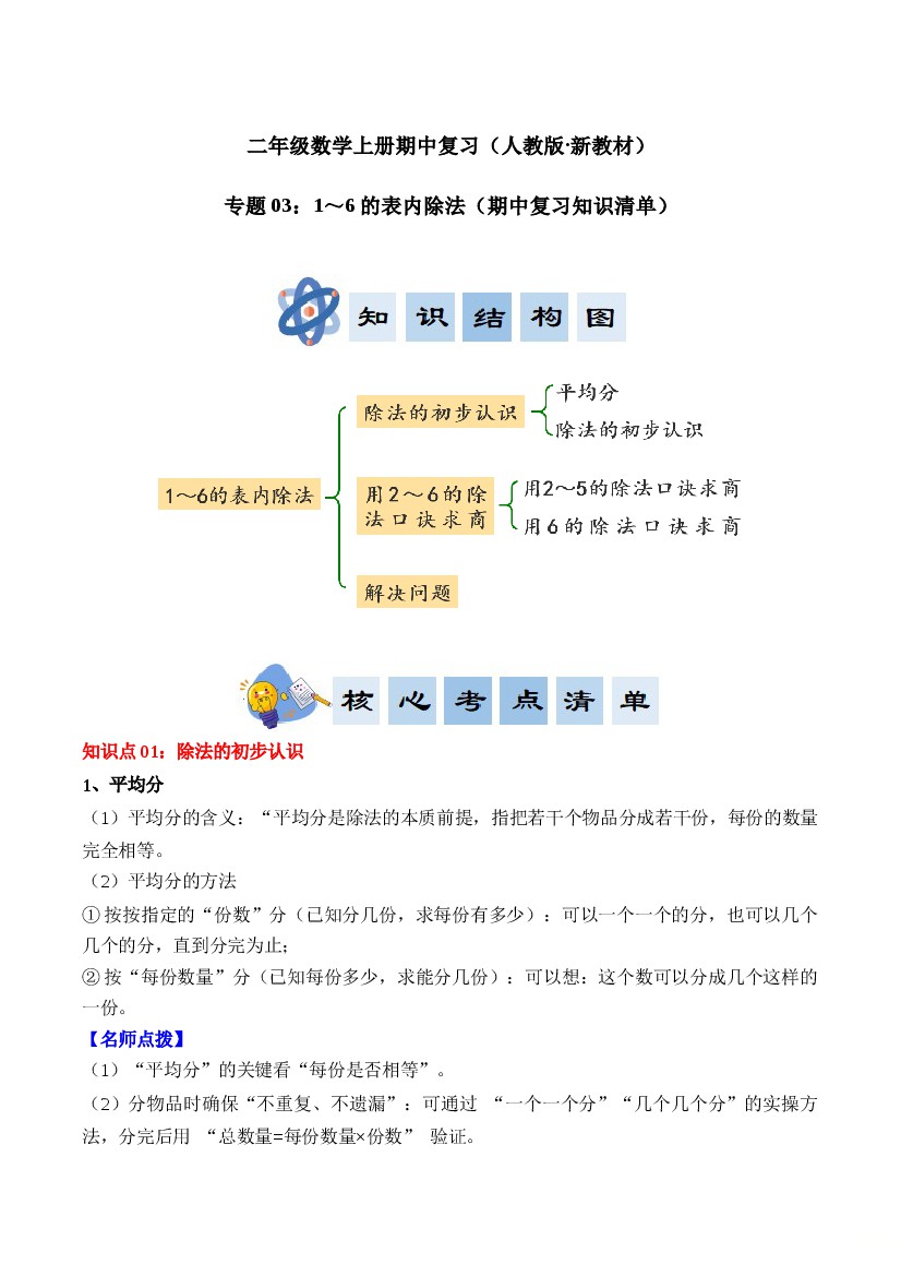专题03:1~6的表内除法(期中知识清单)二年级数学上册(人教版·新教材)(学生版)