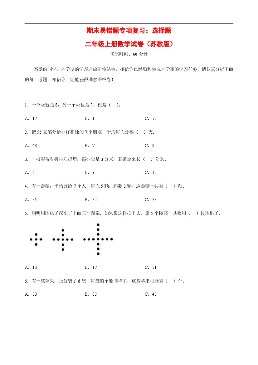 二年级(上)数学 期末易错题专项复习:选择题《苏教版》