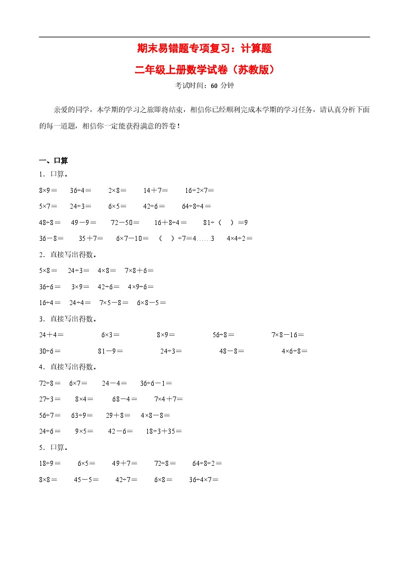 二年级(上)数学 期末易错题专项复习:计算题《苏教版》