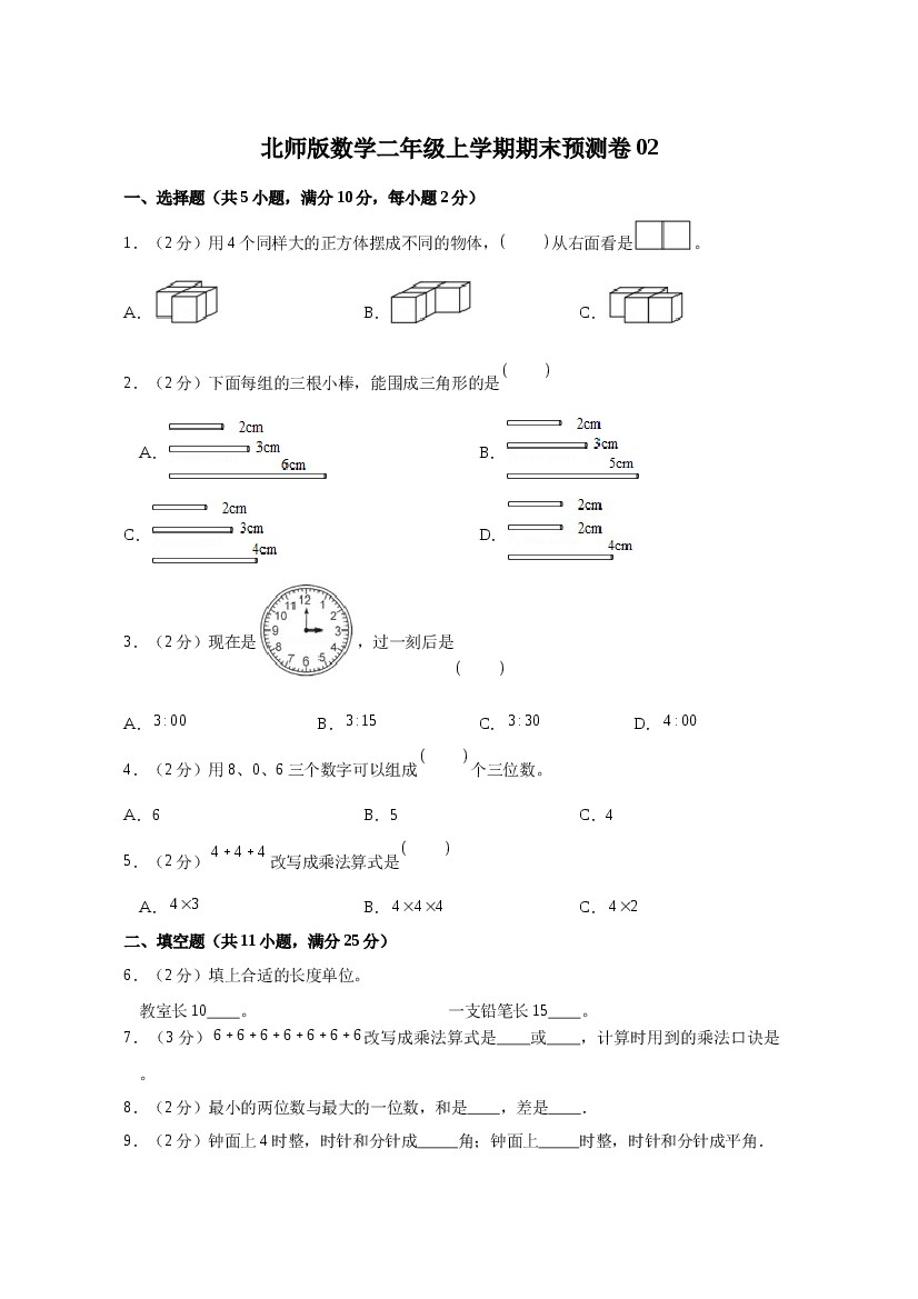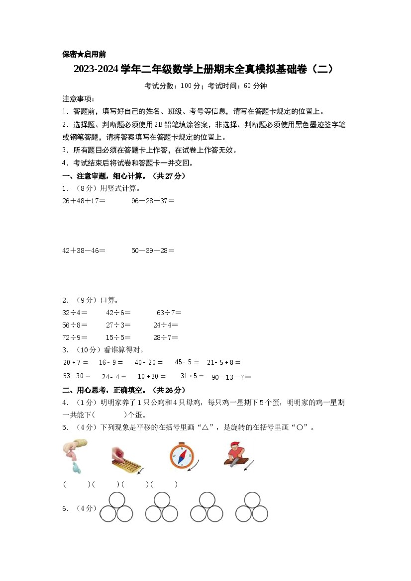 二年级数学上册期末全真模拟基础卷(二)(A4版)(北师大版)
