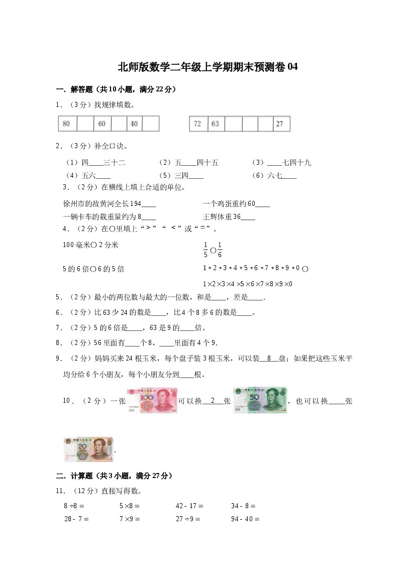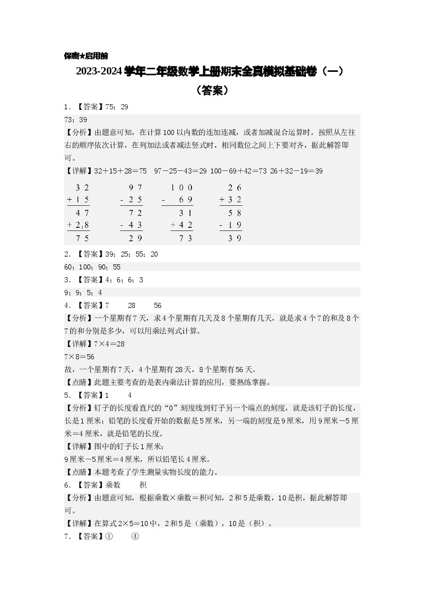 二年级数学上册期末全真模拟基础卷(一)(答案)(北师大版)