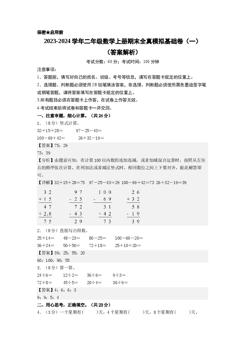 二年级数学上册期末全真模拟基础卷(一)(A4版)(北师大版)