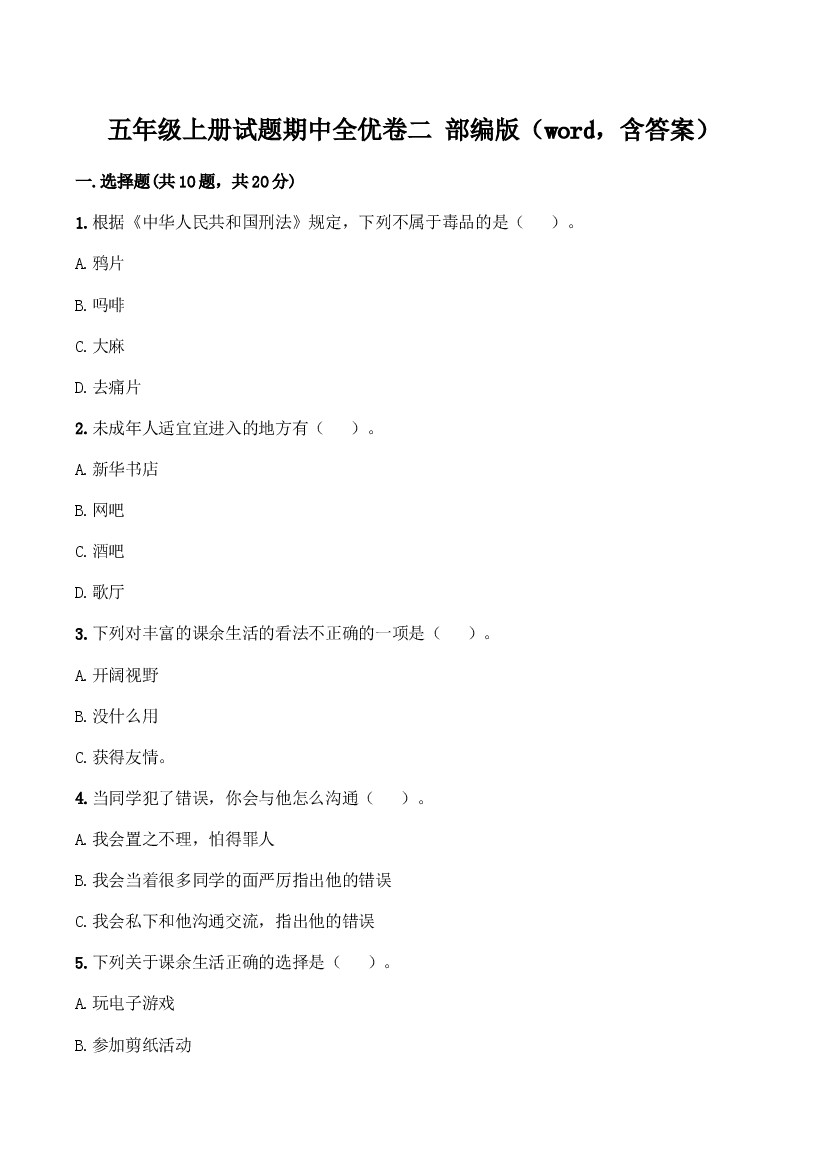 期中全优卷二 部编版(word,含答案)五年级上册道德与法治试题-秋期中全优卷二 部编版(word,含答案)
