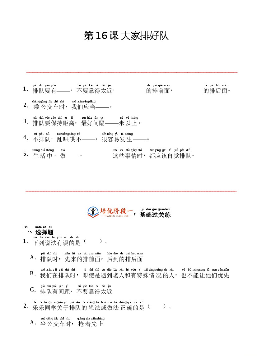第16课 大家排好队-一年级上册道德与法治分层作业