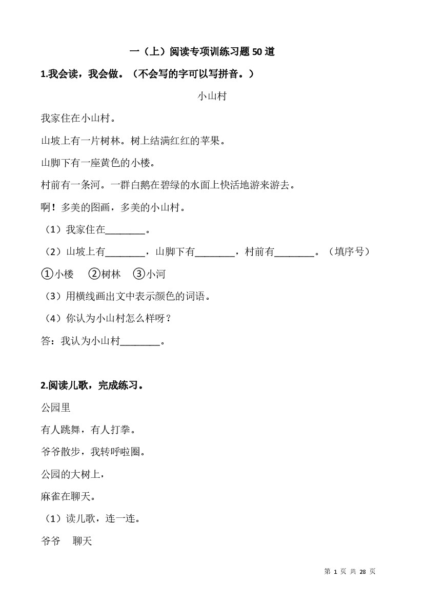 一(上)阅读专项训练习题50道