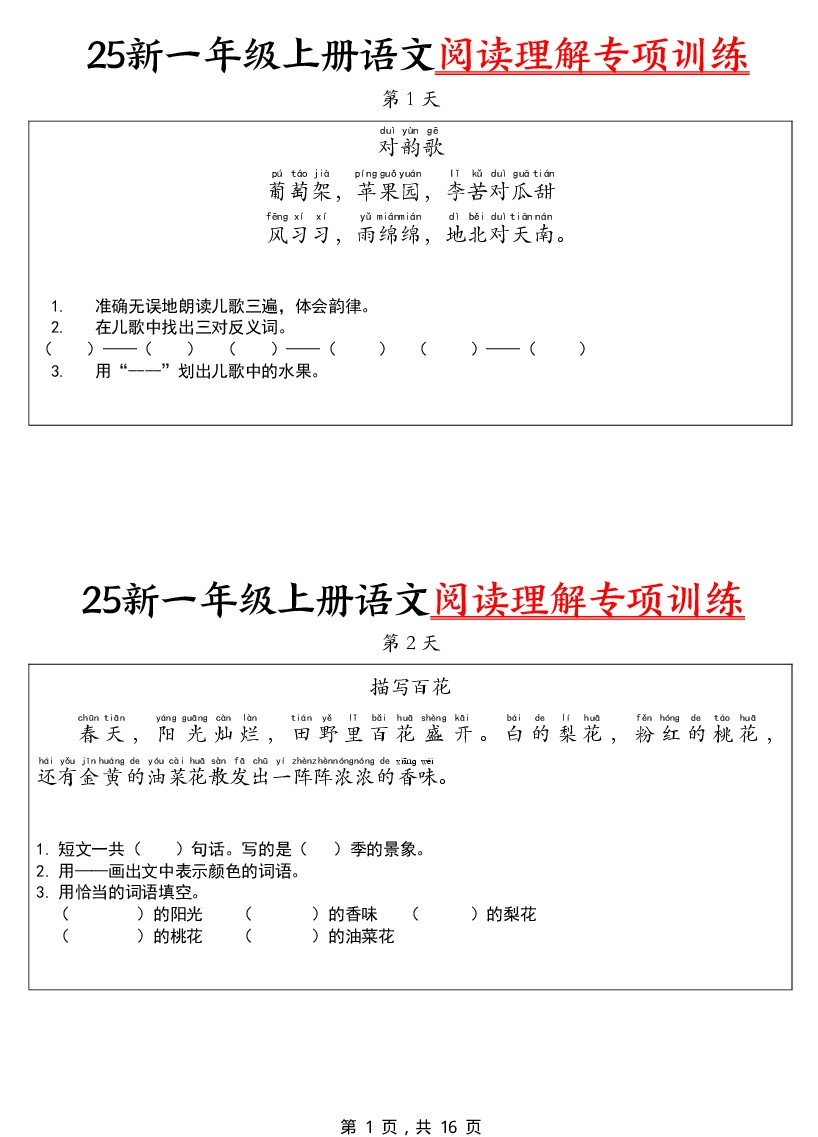 25新一上语文阅读理解专项训练30天(16页)_1