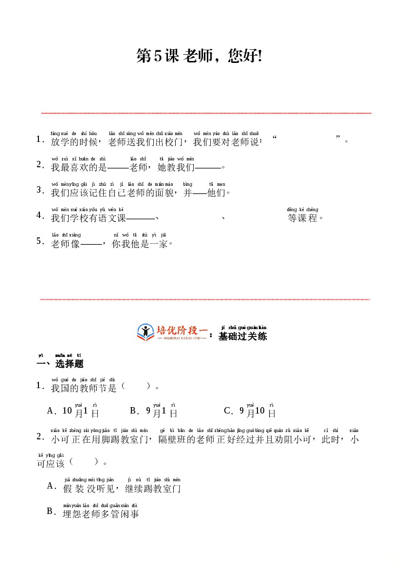 第5课 老师,您好!-一年级上册道德与法治分层作业
