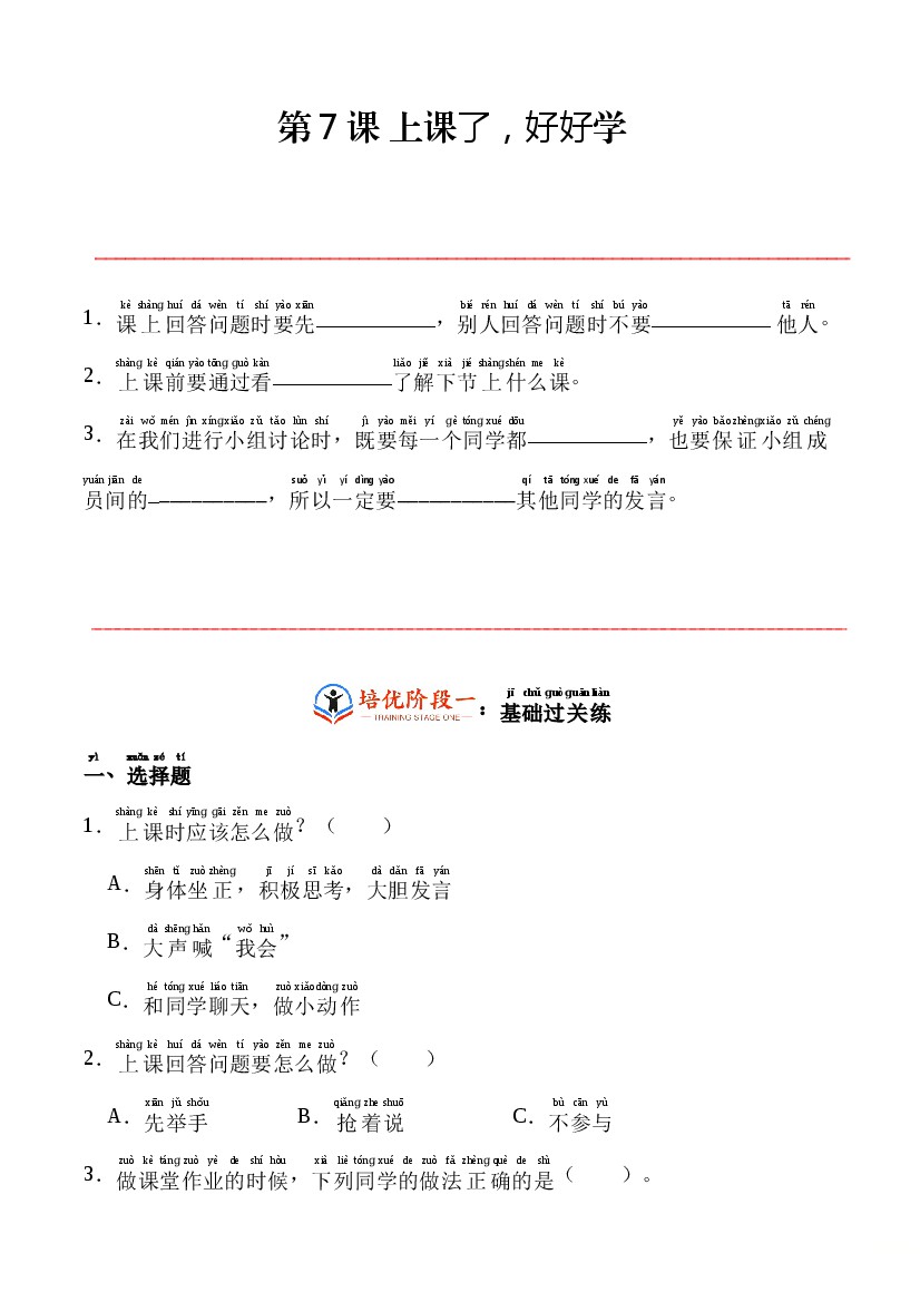 第7课 上课了,好好学-一年级上册道德与法治分层作业