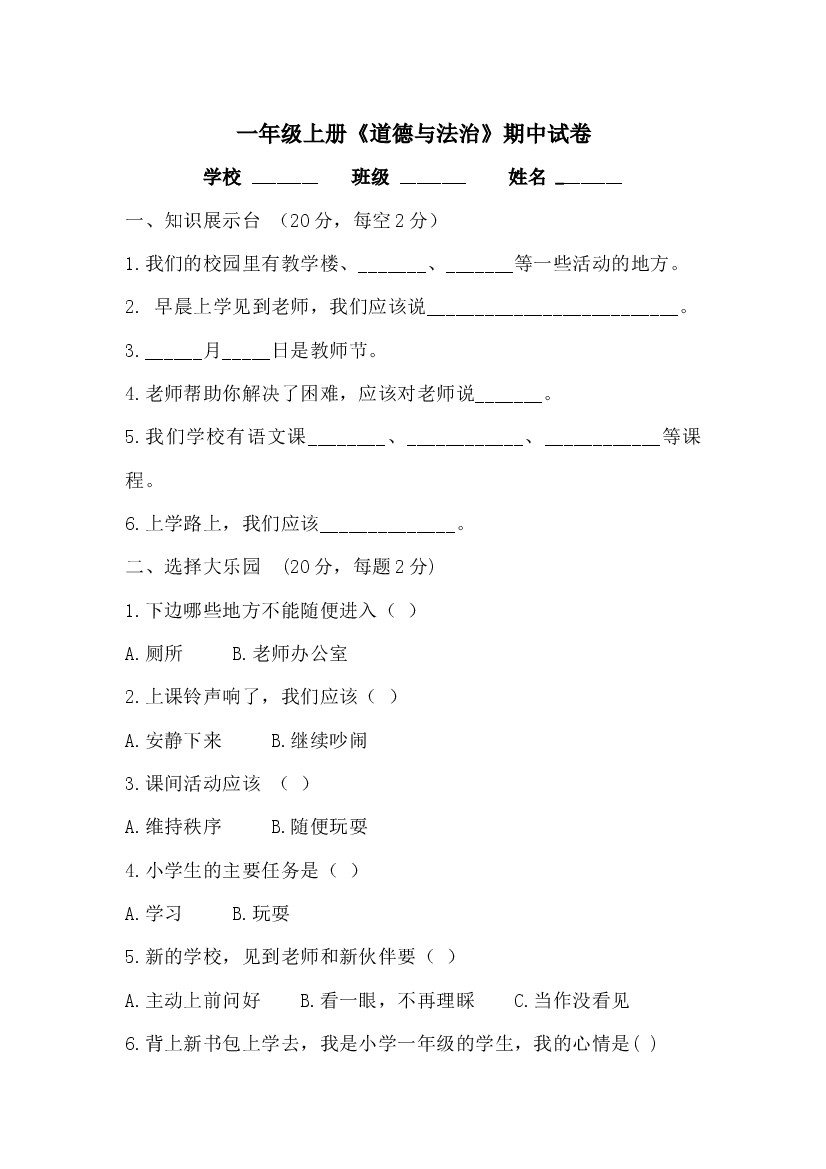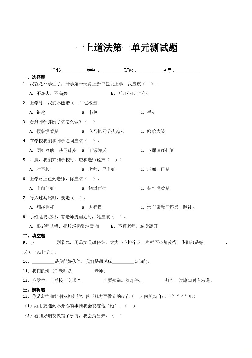 一年级上册道德与法治期中测试人教部编版(含答案)
