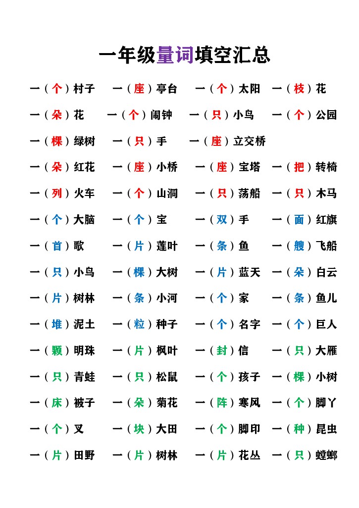 一年级(上)语文 量词填空汇总