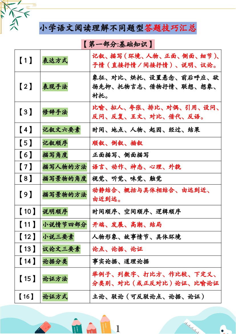 新一上语文阅读理解不同题型答题技巧汇总