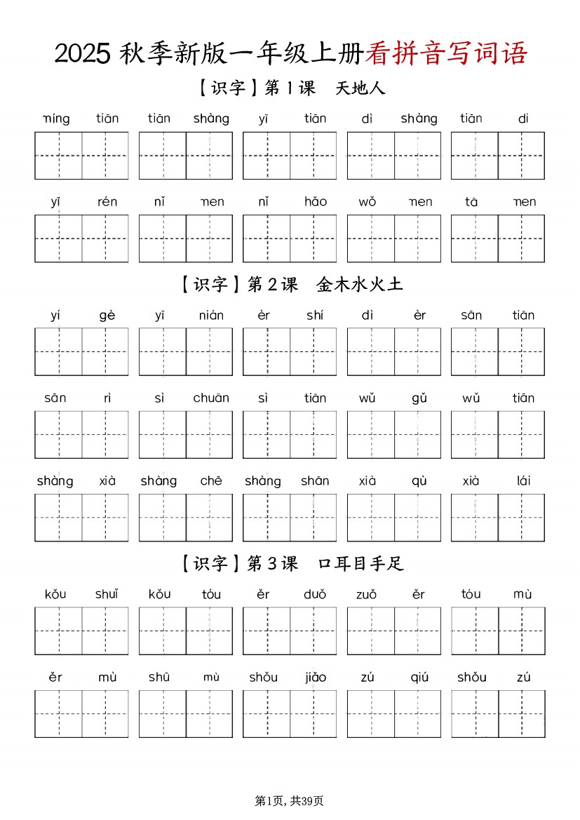 一年级上册1-8单元看拼音写词语