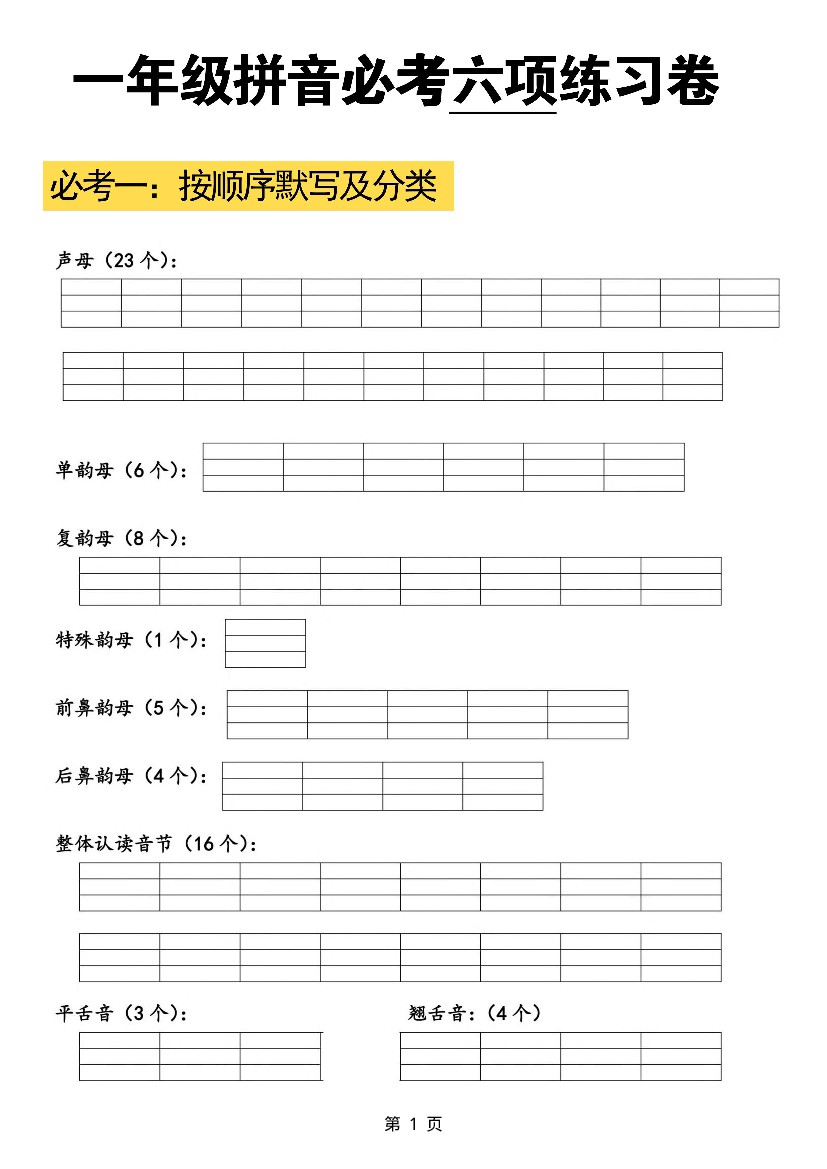一上拼音必考六项练习卷(含答案6页)