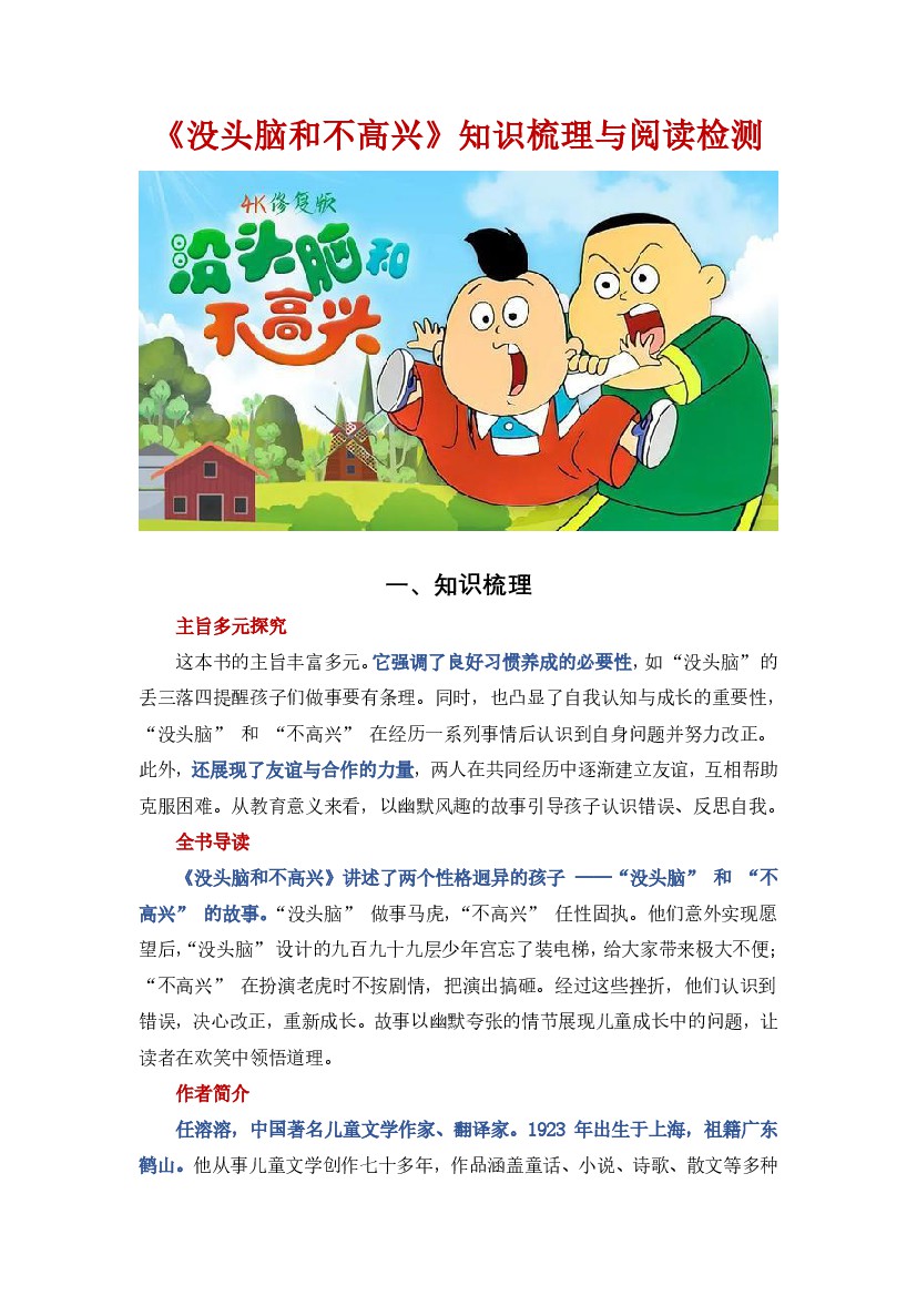 一年级(上)语文《没头脑和不高兴》知识梳理与阅读检测《统编版》