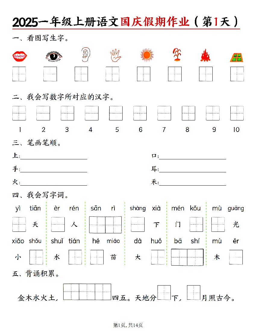 25一上语文国庆假期作业作业(一天一页含答案14页)