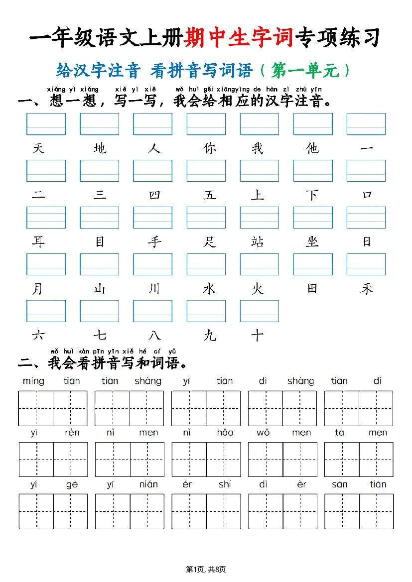 一年级语文上册期中生字词专项练习(8页