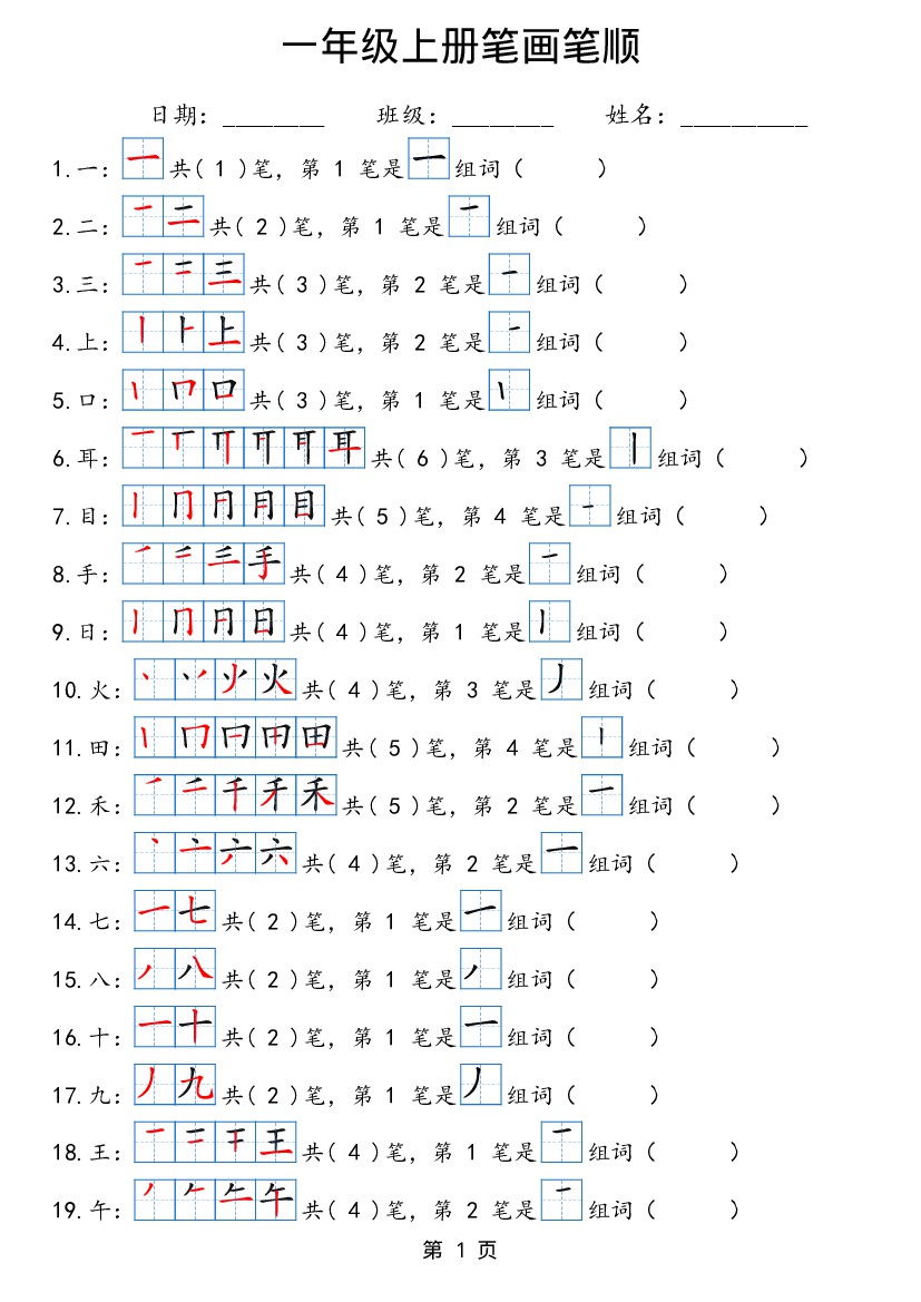 一年级上册语文基础笔画训练