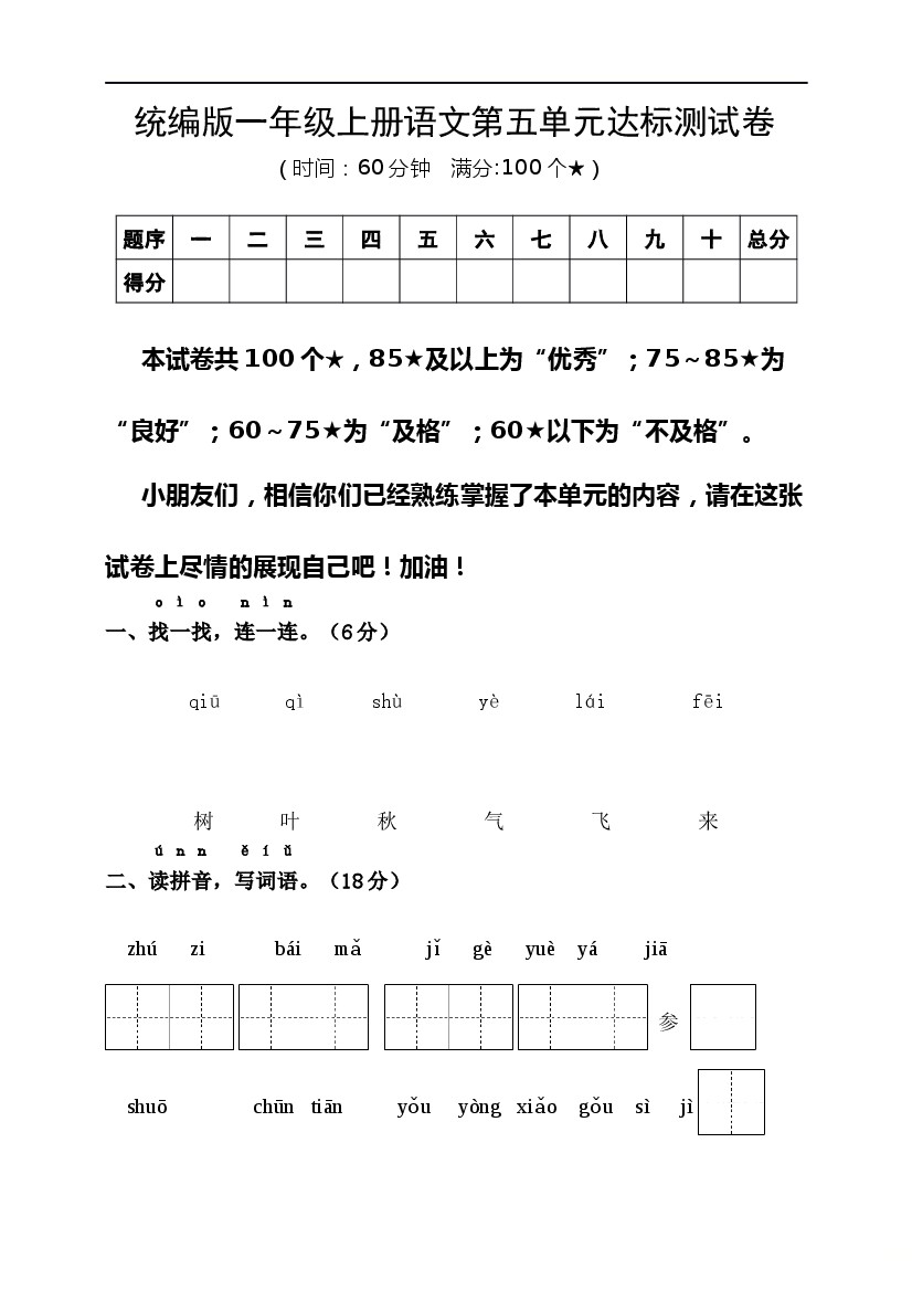 一年级上册语文第五单元 (单元测试)-(统编版)