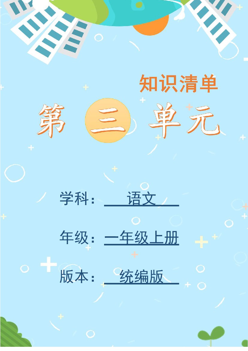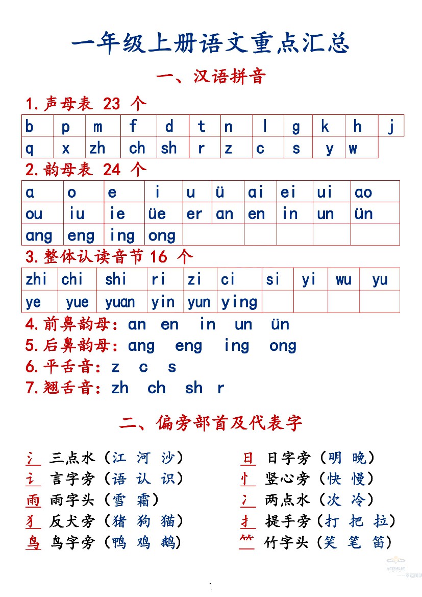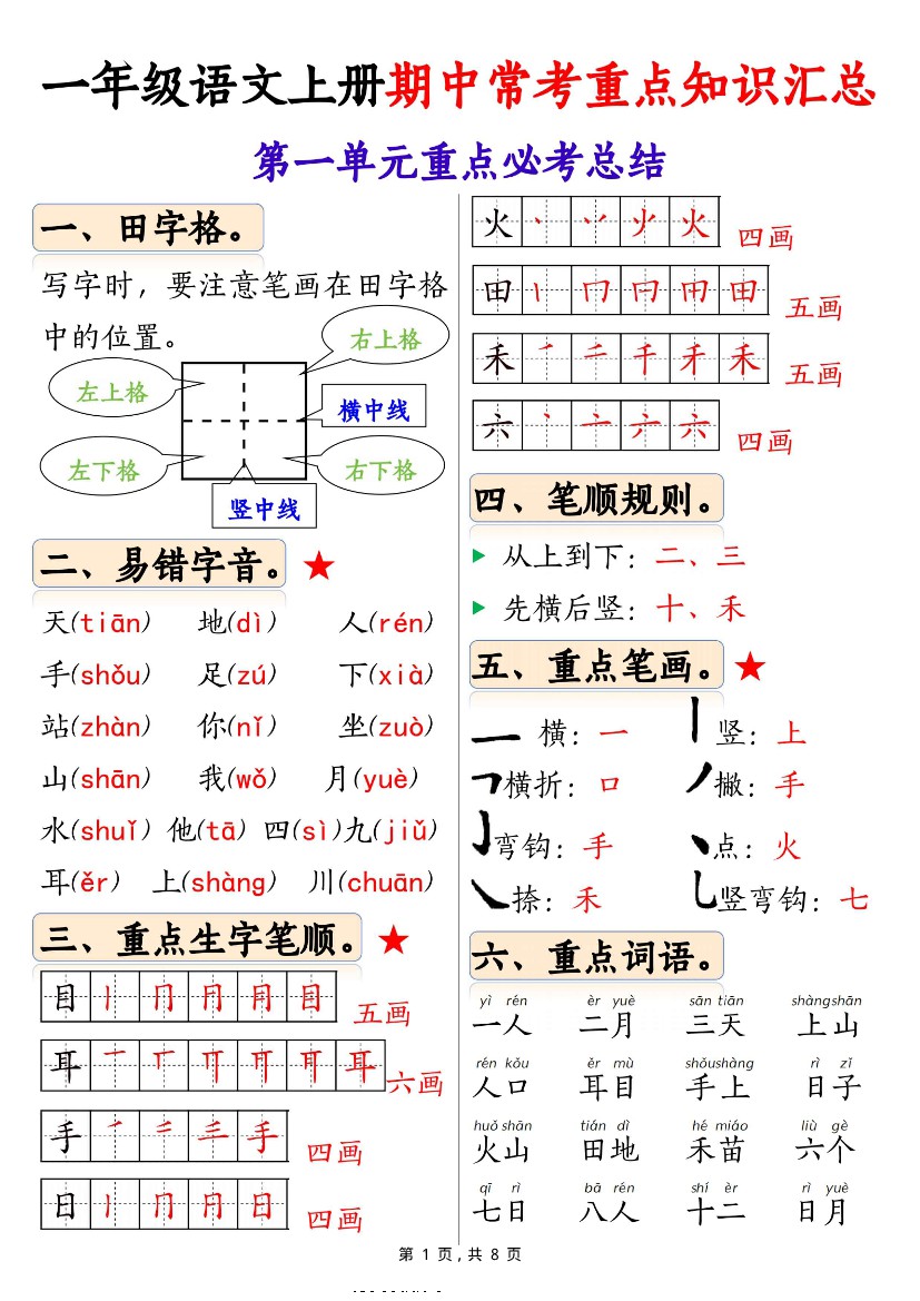 一上语文【期中复习知识点(1-4单元六大必背知识点(8页)】