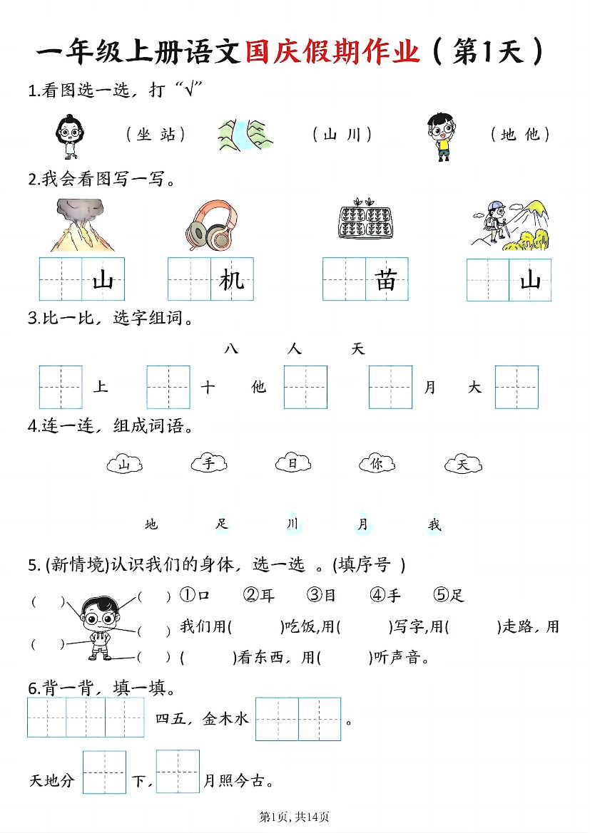 25秋一年级上册语文国庆假期作业7天(含答案14页)