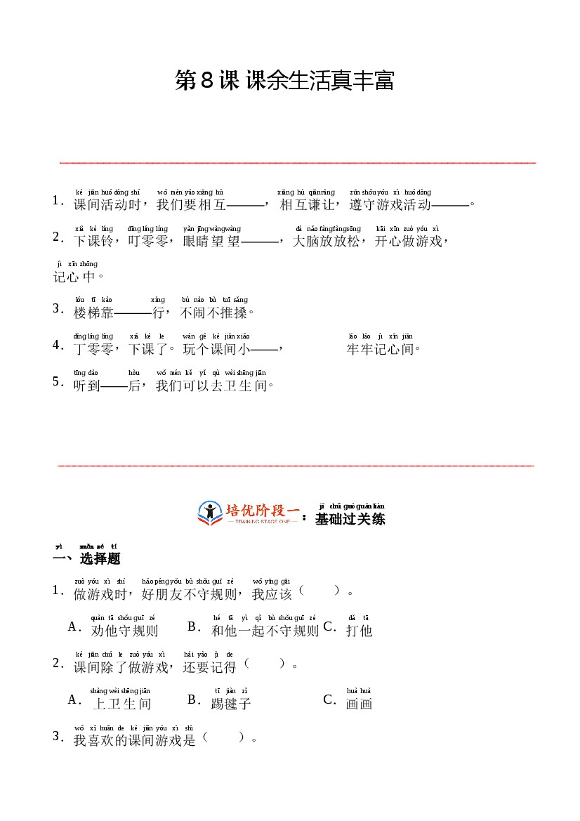 第8课 课余生活真丰富-一年级上册道德与法治分层作业