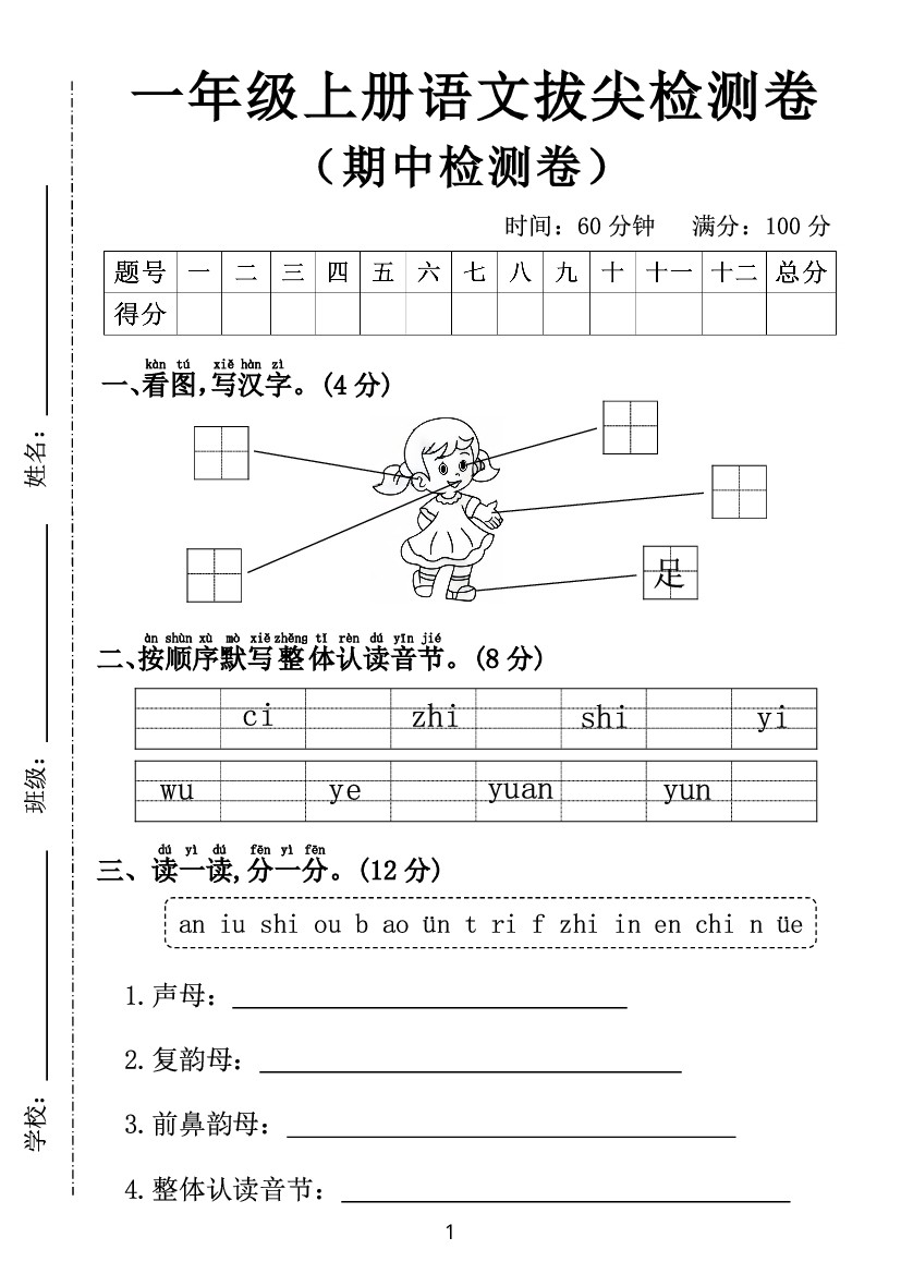 一年级上册语文期中拔尖检测卷(含答案5页)