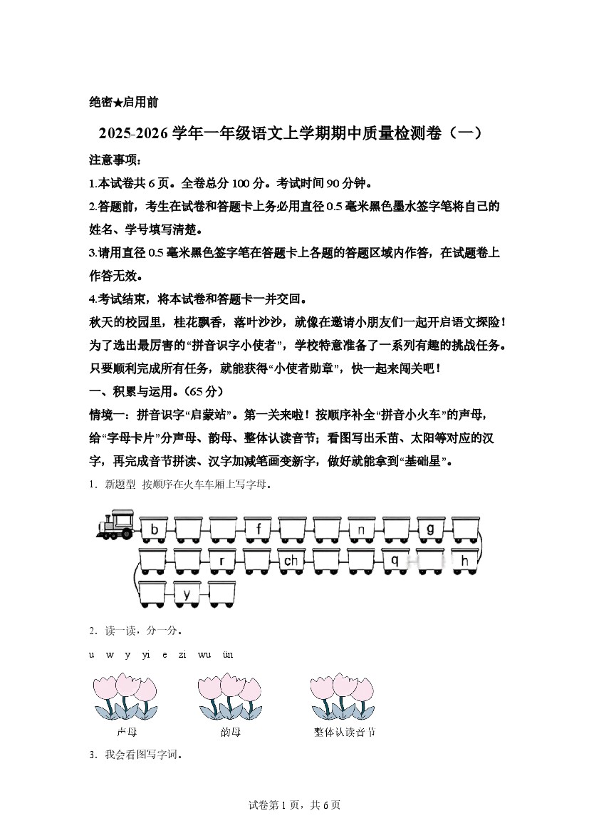 (新教材期中素养卷)25-26一上语文期中素养测评·基础卷01(含答案12页)