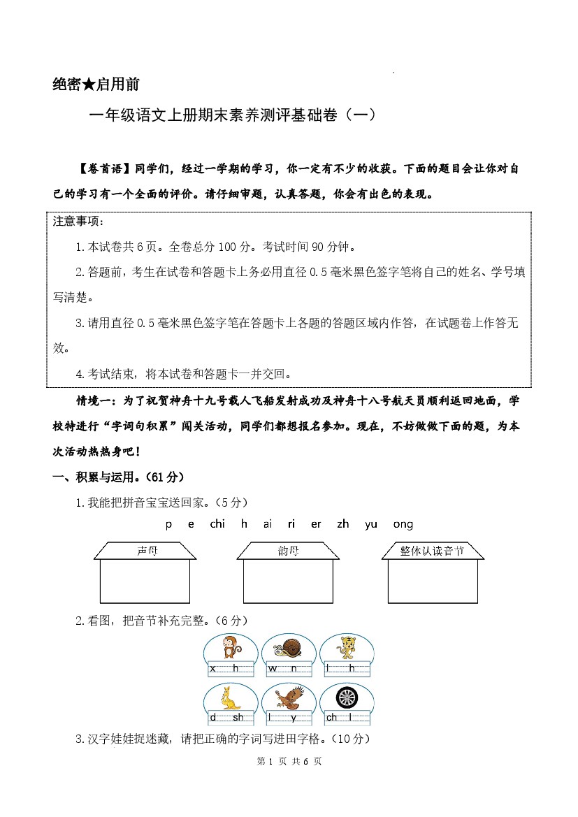 一上语文期末素养测评基础卷一(试卷+答题卡+答案解析20页)