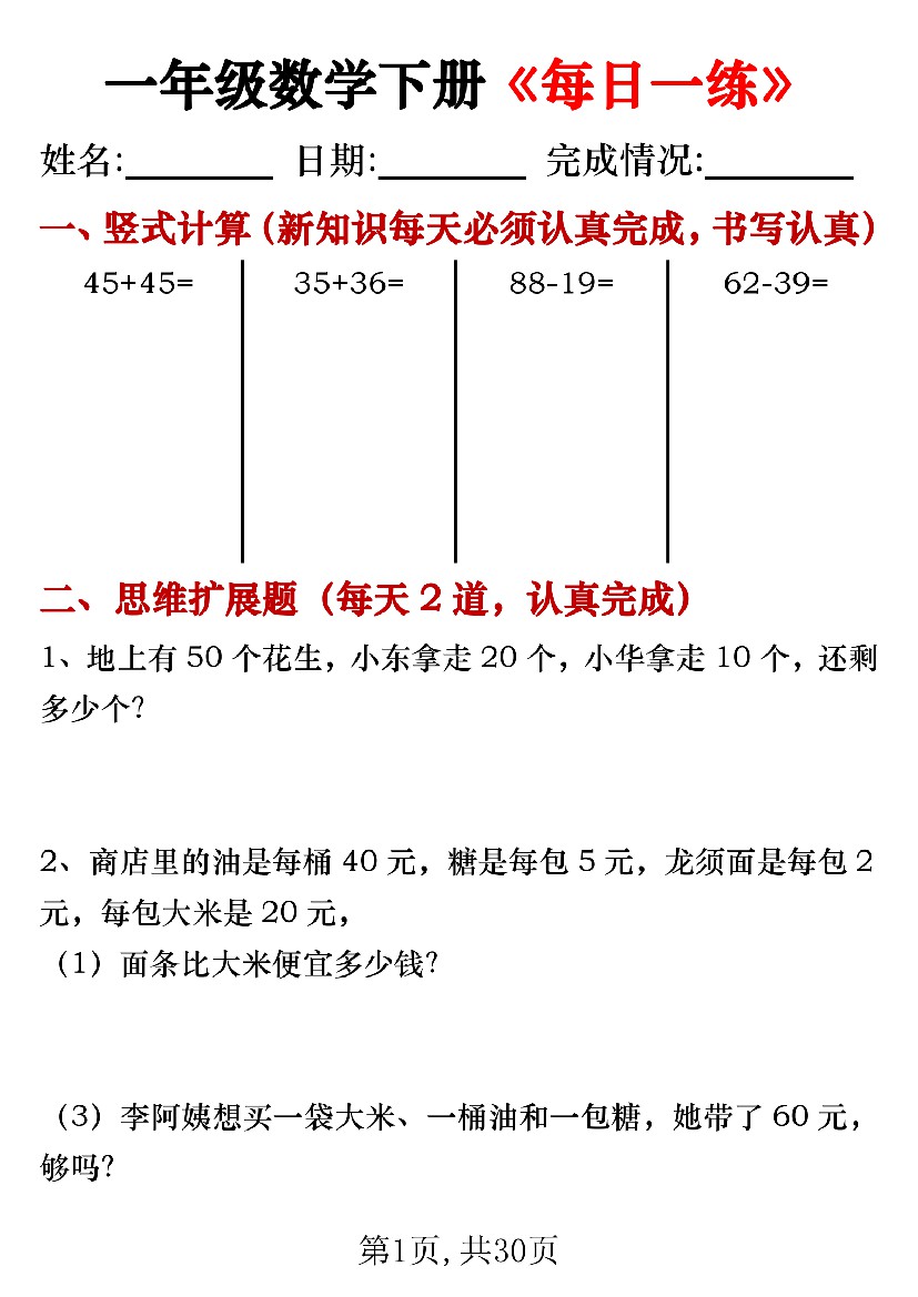 【专项】一年级数学下册《每日一练》竖式+思维拓展题30天