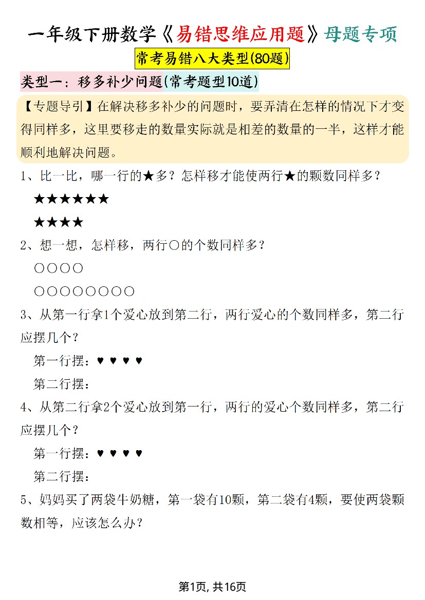 一年级下册数学《易错思维应用题》母题16页