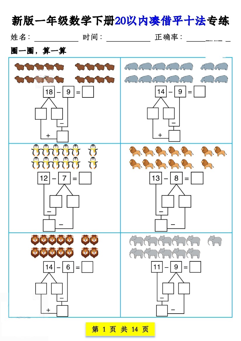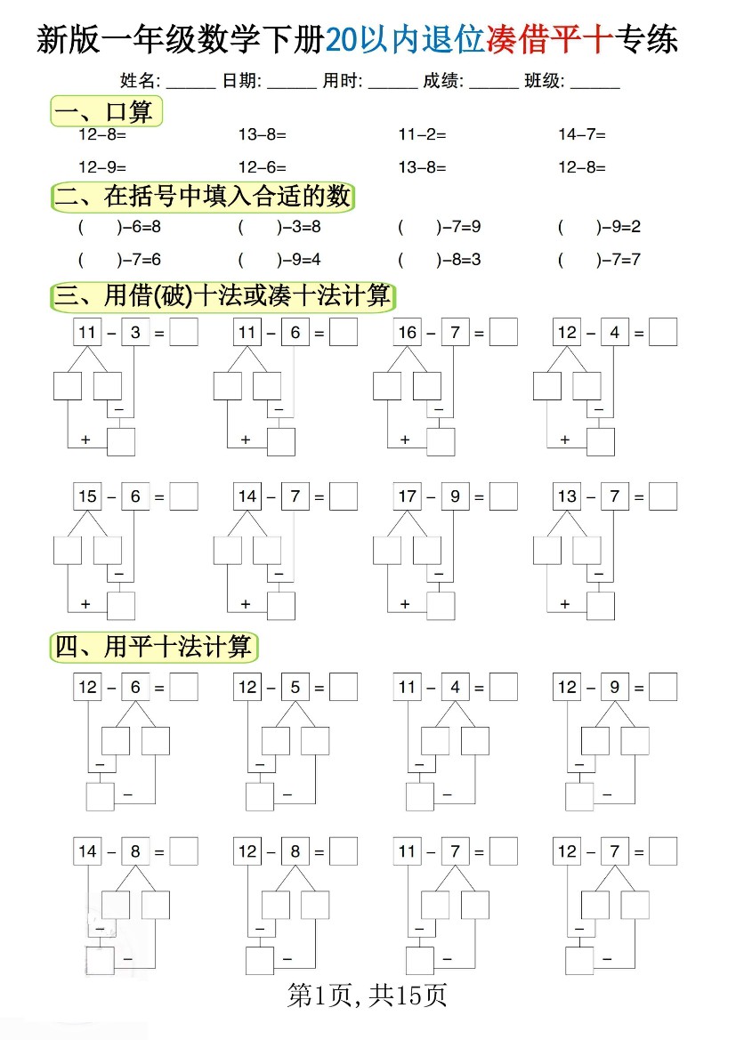 【专项】新一下数学20以内退位凑借平十专练(15页)