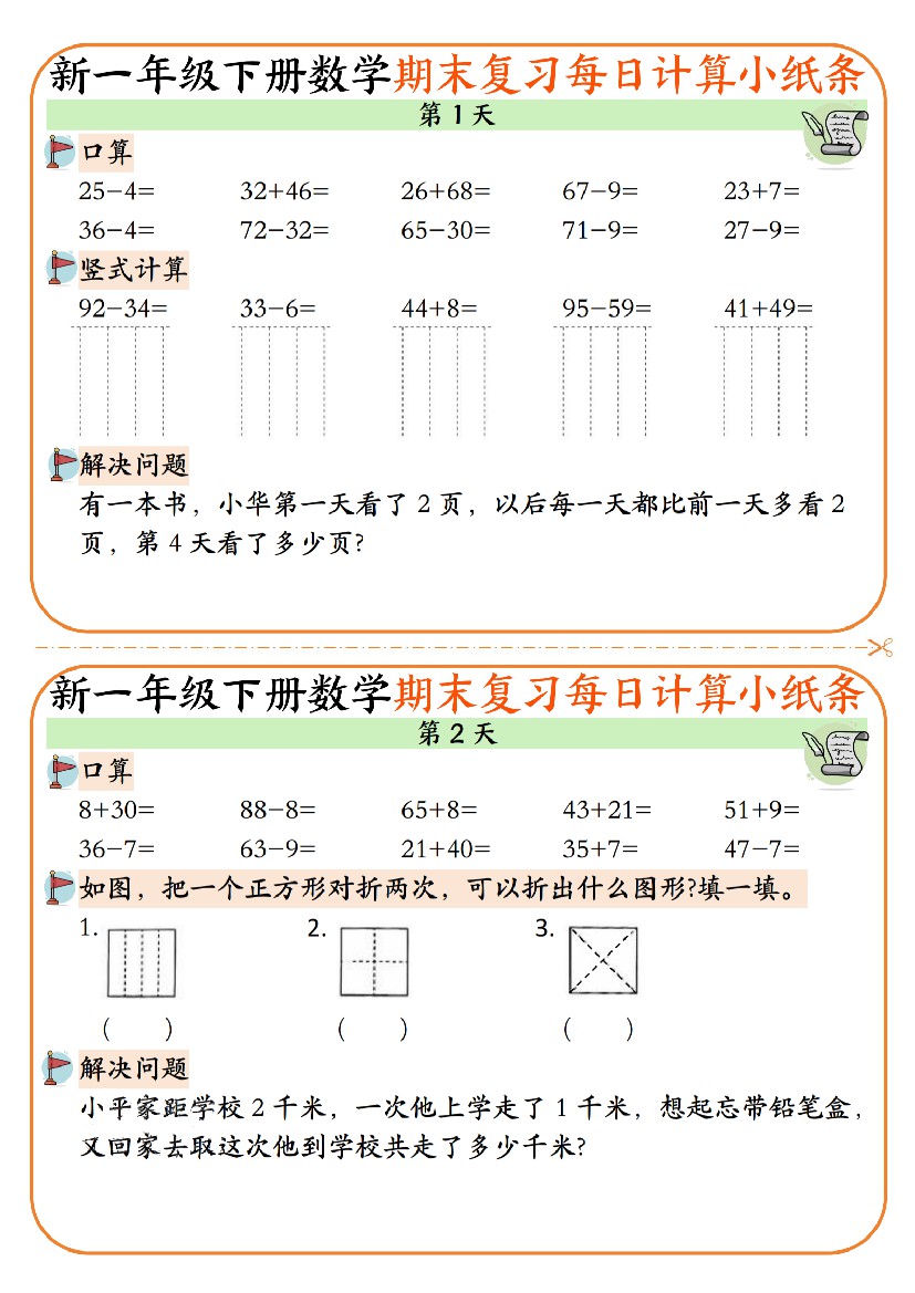 新一年级下册数学期末复习每日计算小纸条12页
