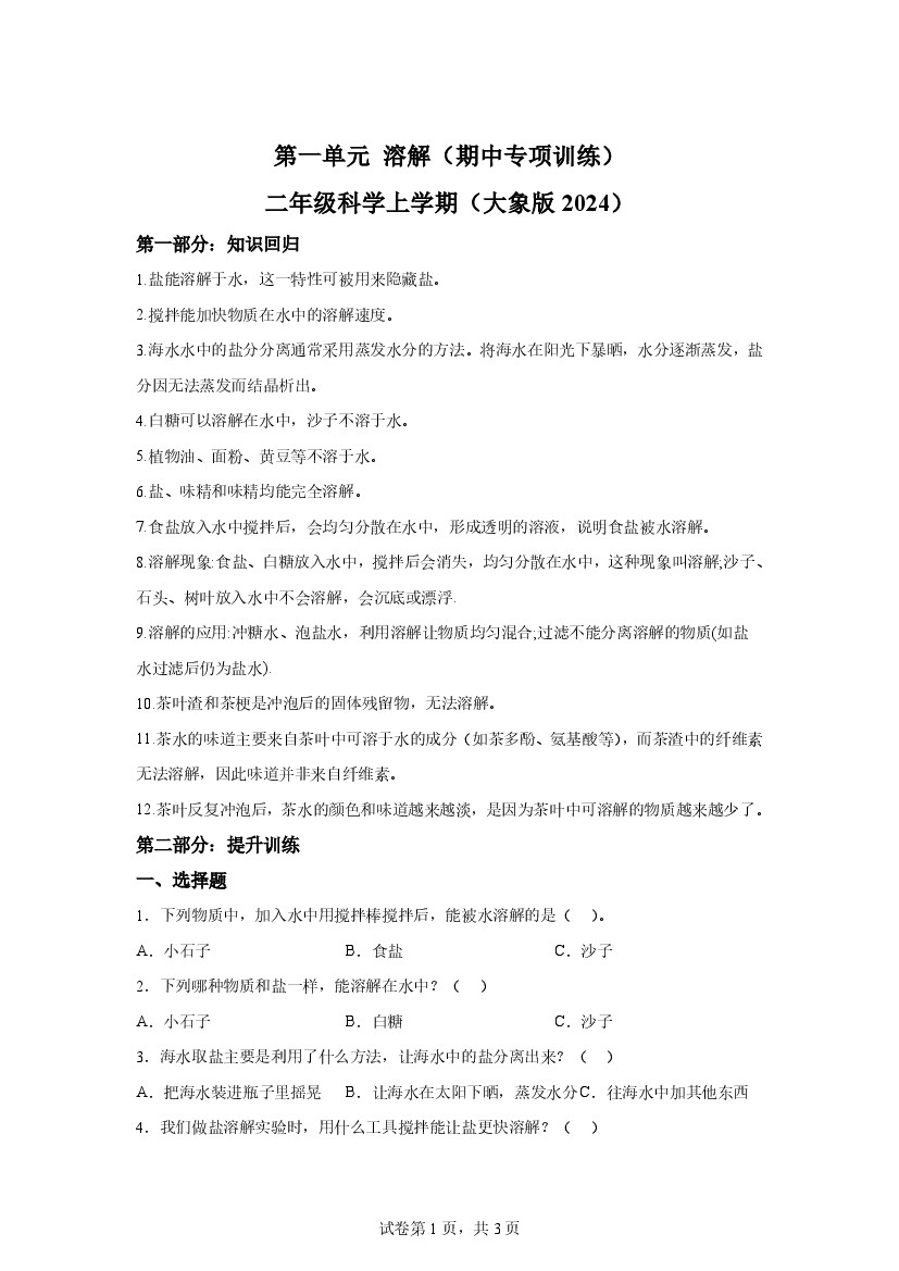 第一单元 溶解(期中专项训练)二年级科学上学期(大象版·新教材)